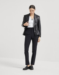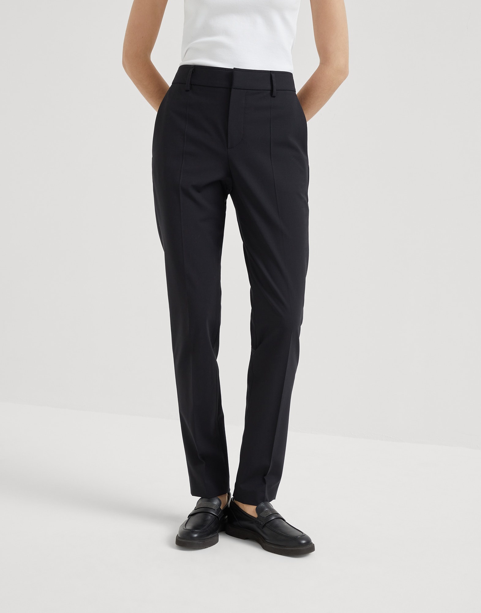 The iconic embellishment of the Brunello Cucinelli collections enriches the style of these Tropical Luxury wool cigarette trousers. A shiny monili insert illuminates the rear belt loop with an elegant sparkle. The slightly fitted, high-waisted cut defines the comfortable silhouette and the distinctly feminine feel of the garment. MATERIALS The lightweight fabric combines the virgin wool natural fiber with a percentage of synthetic to provide added comfort. DETAILS Zip closure with metal hook and backing button Front pockets Back welt pockets Pleat Nickel-free monili decoration 75% VIRGIN WOOL, 23% NYLON, 2% ELASTANE
