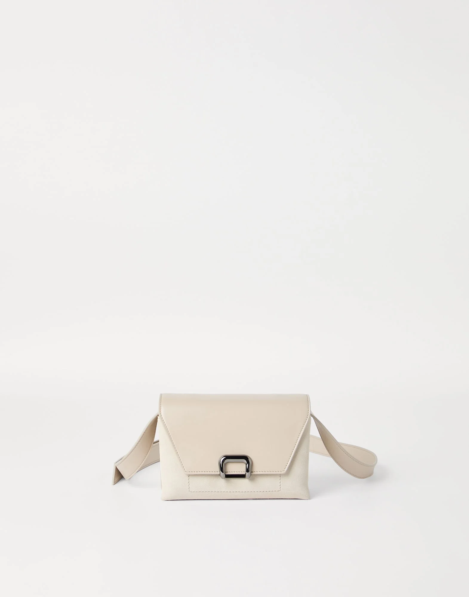 Elegant plays of texture and tailored-inspired details define this new suede and calfskin sartorial bag. Offered in a compact size, the accessory features minimal lines thanks to its construction without visible seams, for a sophisticated, essential appearance. The refined combination between the bag’s smooth leather flap and suede body creates an attractive material contrast. The closure is reminiscent of the design of metal belt buckles, reinterpreted in a new way for a distinctive touch. MATERIALS The bag pairs the typical velvety texture of suede with the ultra-soft touch of calfskin leather. DETAILS Flap closure with magnetic snap Adjustable and detachable shoulder strap Internal compartment with zipper 2 open internal compartments Leather lining 1 slot for cards and business cards Bag is 20 cm long, 7 cm wide and 14 cm high REAL LEATHER