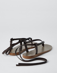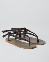Precious details and a summery allure characterize the style of these soft nappa sandals. With thin leather straps that tie at the ankle, the essential design is inspired by the classic thong, illuminated with an embroidery in rows of shiny monili for a feminine touch in true Brunello Cucinelli style. A fine, rounded leather outsole pairs perfectly with the footwear’s light silhouette. MATERIALS The fine grain of the Soft nappa leather is a completely natural texture, in which small irregularities are valuable factors that elevate the quality of the leather. DETAILS Ribbons tie at ankle Leather sole TPU rubber tread Non-slip rubber insert Nickel-free monili decoration REAL LEATHER