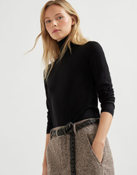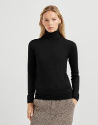 The excellence of Brunello Cucinelli materials enriches the essential shape of the new turtleneck sweater. An ultra lightweight and soft texture of the cashmere and silk yarn combines with the regular fit in both the chest and shoulders which is pleasing to wear. MATERIALS Cashmere and silk fibers are manufactured together with a fine lame thread to enrich the texture with delicate metallic reflections. The presence of a synthetic fiber provides added comfort. DETAILS High collar Regular shoulder Regular sleeve Plain stitch 51% CASHMERE, 22% SILK, 20% NYLON, 7% POLYESTER