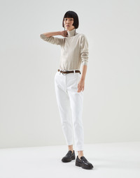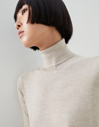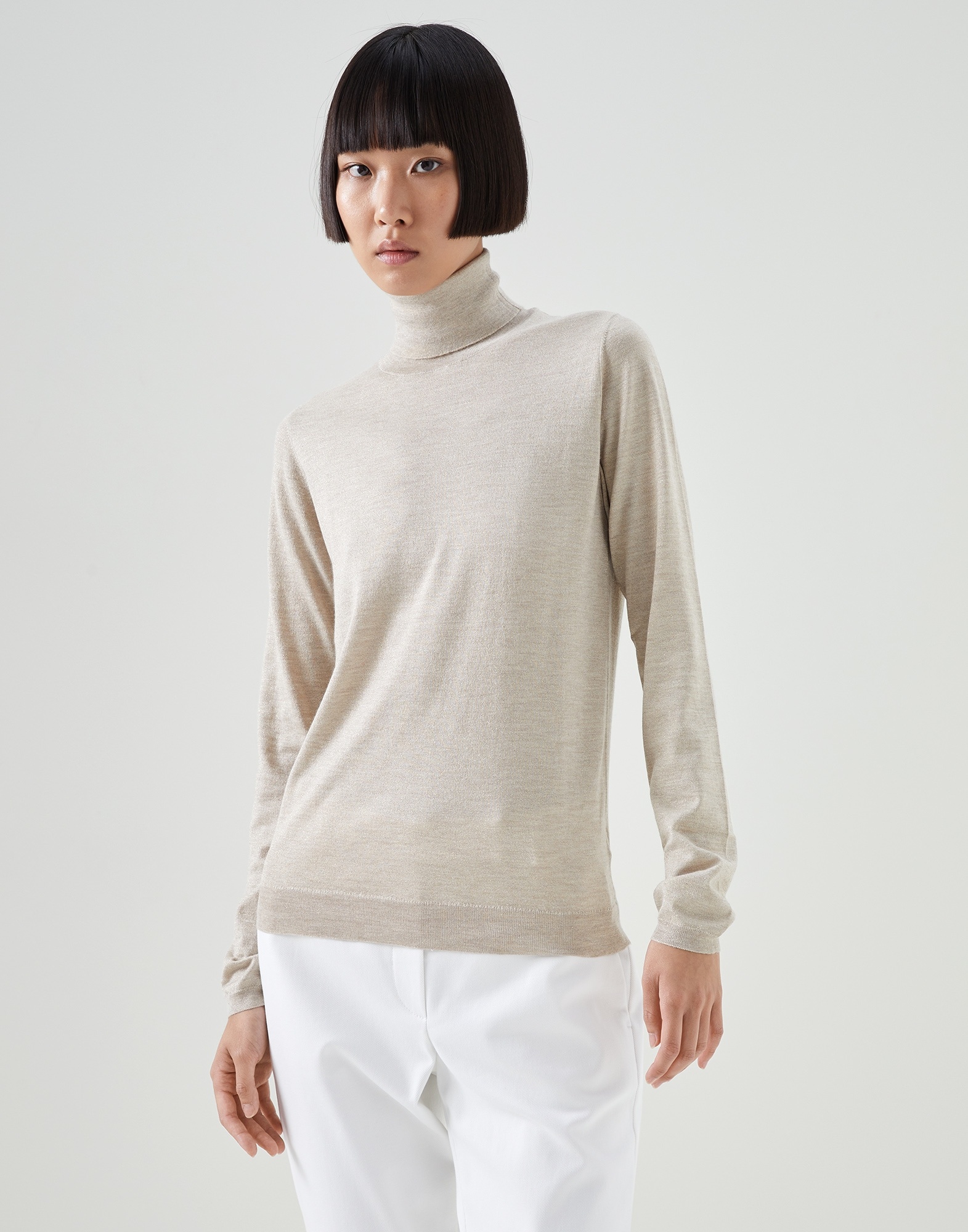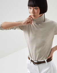 The excellence of Brunello Cucinelli materials enriches the essential shape of the new turtleneck sweater. An ultra lightweight and soft texture of the cashmere and silk yarn combines with the regular fit in both the chest and shoulders which is pleasing to wear. MATERIALS The cashmere and silk fibers are manufactured together with a lamé thread to enrich the texture with delicate metallic reflections. The presence of a synthetic fiber provides added comfort. DETAILS High collar Regular shoulder Regular sleeve Plain stitch 51% CASHMERE, 22% SILK, 20% NYLON, 7% POLYESTER