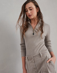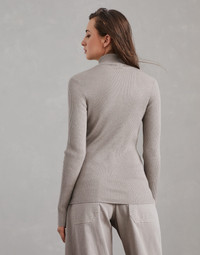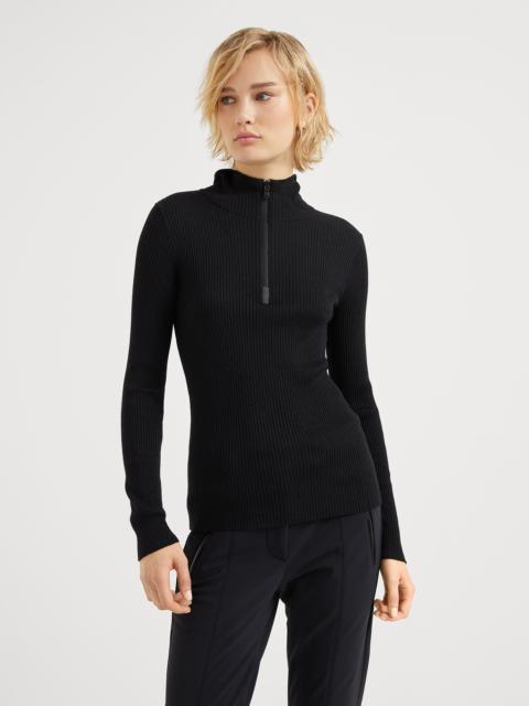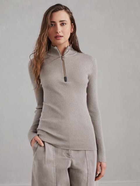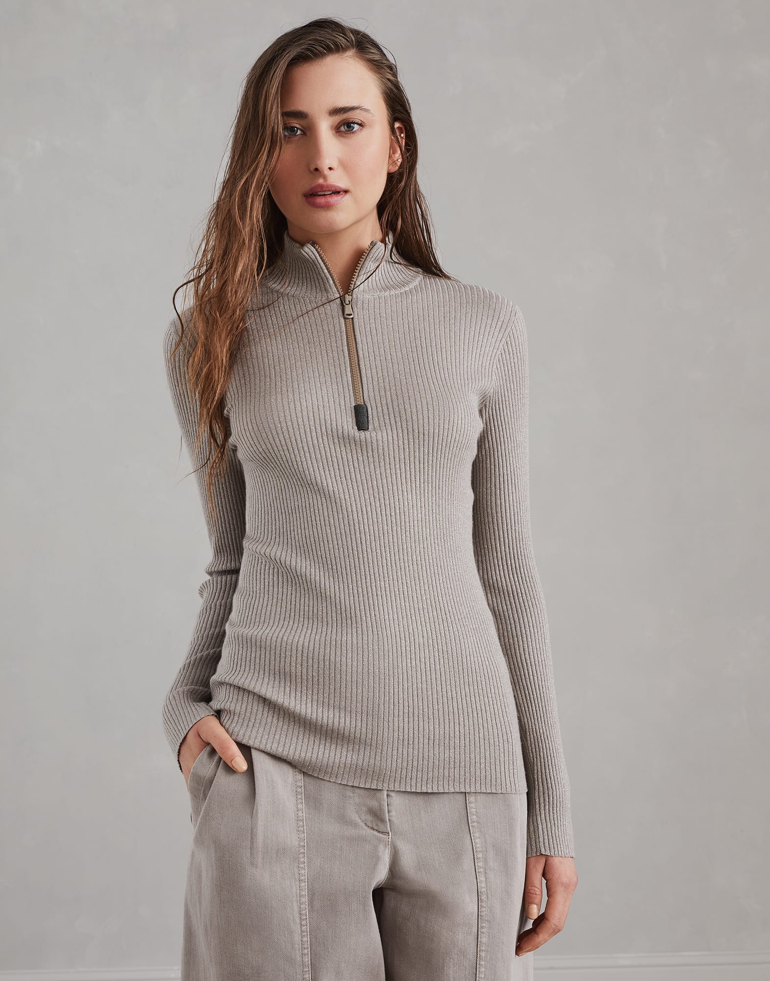 The excellence of Brunello Cucinelli materials elevates the essential feel of this lightweight cashmere and silk Sparkling yarn sweater. Timeless rib knitting combines the refined qualities of the natural fibers with a lame thread, spreading delicate metallic reflections throughout the garment’s surface. The silhouette offers comfortable, fitted lines, while the zipper closure is highlighted by a shiny monili embroidery for a touch of feminine sparkle. MATERIALS Cashmere and silk fibers are manufactured together with a fine lame thread to enrich the texture with delicate metallic reflections. The presence of a synthetic fiber provides added comfort. DETAILS Zip opening Funnel neck Regular shoulder Regular sleeve Rib knit Nickel-free monili decoration 51% CASHMERE, 22% SILK, 20% NYLON, 7% POLYESTER