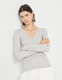 Refined materials enhance traditional knitting in this new V-neck sweater in cashmere and silk Sparkling yarn. The shimmering reflections of the lame thread enrich the rib knit surface with a delicate sparkle. The garment features long sleeves and a comfortable tapered fit. MATERIALS Cashmere and silk fibers are manufactured together with a fine lame thread to enrich the texture with delicate metallic reflections. The presence of a synthetic fiber provides added comfort. DETAILS V-neck Regular shoulder Regular sleeve Rib knit 51% CASHMERE, 22% SILK, 20% NYLON, 7% POLYESTER