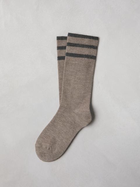 A must-have women’s accessory, these cashmere Sparkling yarn socks convey the beauty of Brunello Cucinelli knitwear. The soft yarn marries the superior qualities of the natural fibers with a lame thread that spreads delicate metallic reflections throughout the surface. MATERIALS The soft and lightweight cashmere Sparkling yarn combines the natural fiber’s refined qualities with a lame thread that enriches the texture with delicate reflections. DETAILS Calf length 46% CASHMERE, 41% VISCOSE, 13% POLYESTER