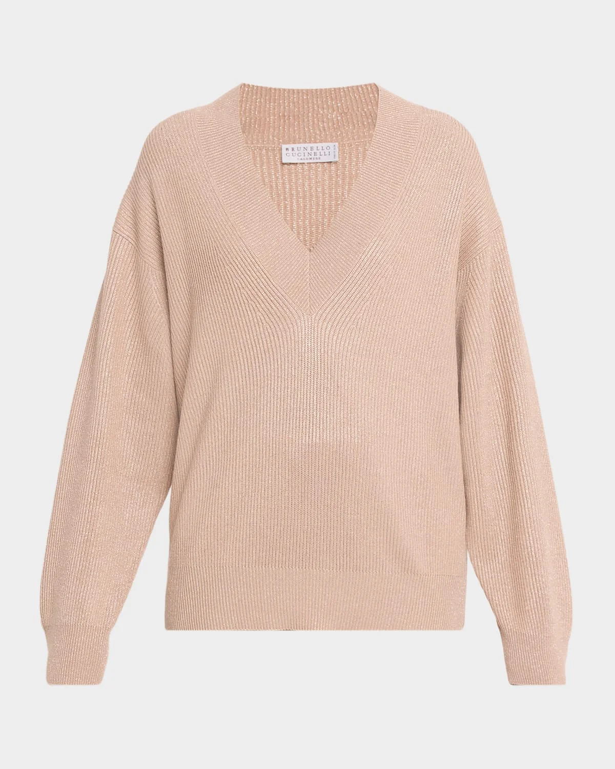 Crafted from sparkling cashmere ribbed knit, this sweater from Brunello Cucinelli features an oversized silhouette with dropped shoulders V neckline Long sleeves Drop shoulders Oversized fit Hem falls below the hip Ribbed cuffs and hem & nbsp; Pullover style Cashmere/viscose/nylon/polyamide Dry clean Made in Italy SIZE & FITModel measurements: 5 & apos;10" tallModel is wearing a US size 4/Small