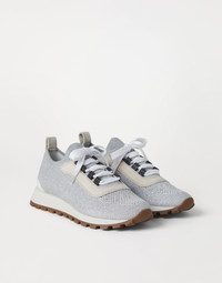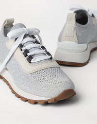 Inspired by the refined yarns of Brunello Cucinelli knitwear, these sparkling cotton knit sneakers reinterpret the sporty look of classic designs in an elegant way. The jacquard knitting of the extremely lightweight fabric creates a subtle gradient effect on the front part, highlighted by the lame appearance of the yarn. Velvety suede inserts add a sophisticated texture contrast. The monili embroidered lace loops complement the style of this footwear with a precious and feminine touch. MATERIALS Manufacturing of the Sparkling knit includes a metallic thread that spreads delicate sparkling reflections along the surface. A lightweight rubber outsole and tread provide added comfort when worn. DETAILS Cotton laces Leather lining Sole in lightweight micro rubber TPU rubber tread Nickel-free monili decoration 55% COTTON, 35% VISCOSE, 10% POLYESTER