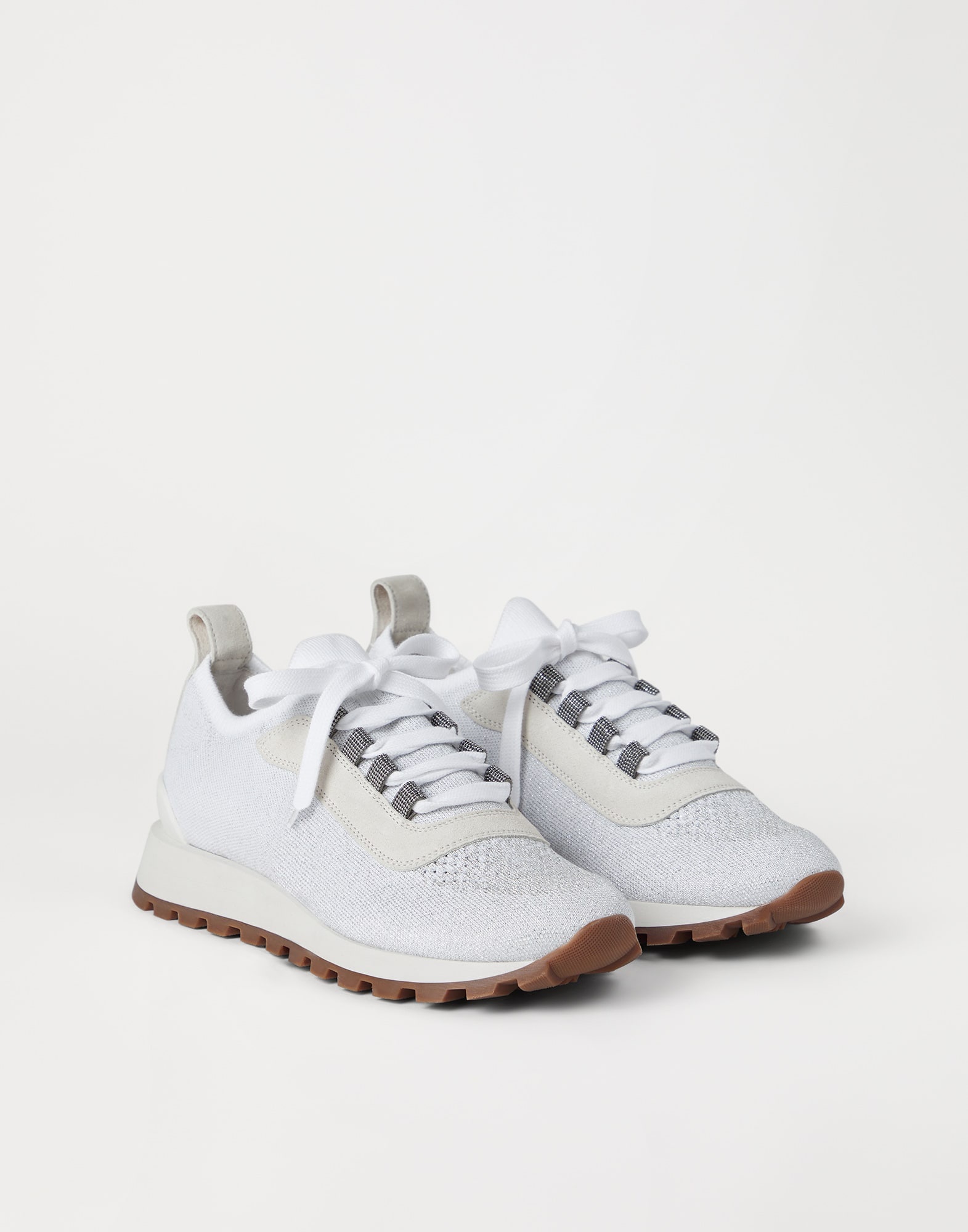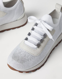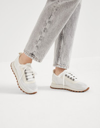 Inspired by the refined yarns of Brunello Cucinelli knitwear, these sparkling cotton knit sneakers reinterpret the sporty look of classic designs in an elegant way. The jacquard knitting of the extremely lightweight fabric creates a subtle gradient effect on the front part, highlighted by the lame appearance of the yarn. Velvety suede inserts add a sophisticated texture contrast. The monili embroidered lace loops complement the style of this footwear with a precious and feminine touch. MATERIALS Manufacturing of the Sparkling knit includes a metallic thread that spreads delicate sparkling reflections along the surface. A lightweight rubber outsole and tread provide added comfort when worn. DETAILS Cotton laces Leather lining Sole in lightweight micro rubber TPU rubber tread Nickel-free monili decoration 55% COTTON, 35% VISCOSE, 10% POLYESTER
