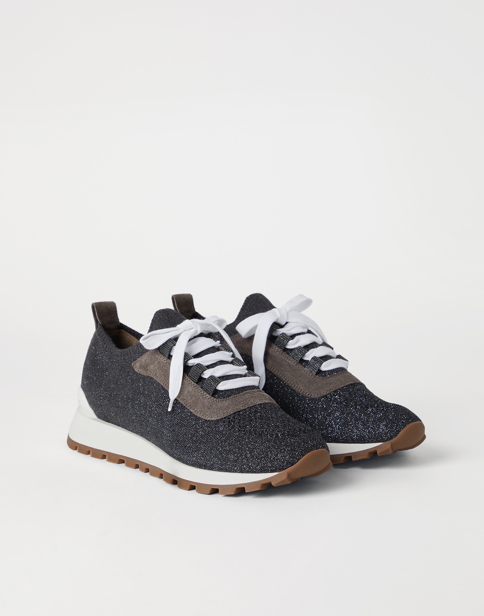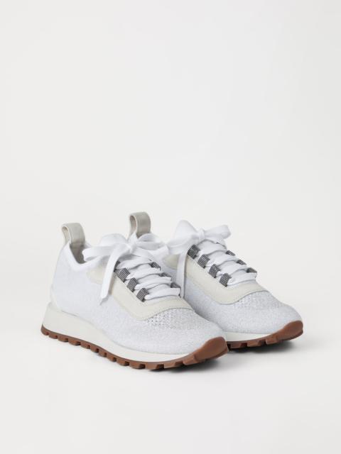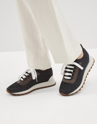 Inspired by the refined yarns of Brunello Cucinelli knitwear, these sparkling cotton knit sneakers reinterpret the sporty look of classic designs in an elegant way. The jacquard knitting of the extremely lightweight fabric creates a subtle gradient effect on the front part, highlighted by the lame appearance of the yarn. Velvety suede inserts add a sophisticated texture contrast. The monili embroidered lace loops complement the style of this footwear with a precious and feminine touch. MATERIALS Manufacturing of the Sparkling knit includes a metallic thread that spreads delicate sparkling reflections along the surface. A lightweight rubber outsole and tread provide added comfort when worn. DETAILS Cotton laces Leather lining Sole in lightweight micro rubber TPU rubber tread Nickel-free monili decoration 55% COTTON, 35% VISCOSE, 10% POLYESTER