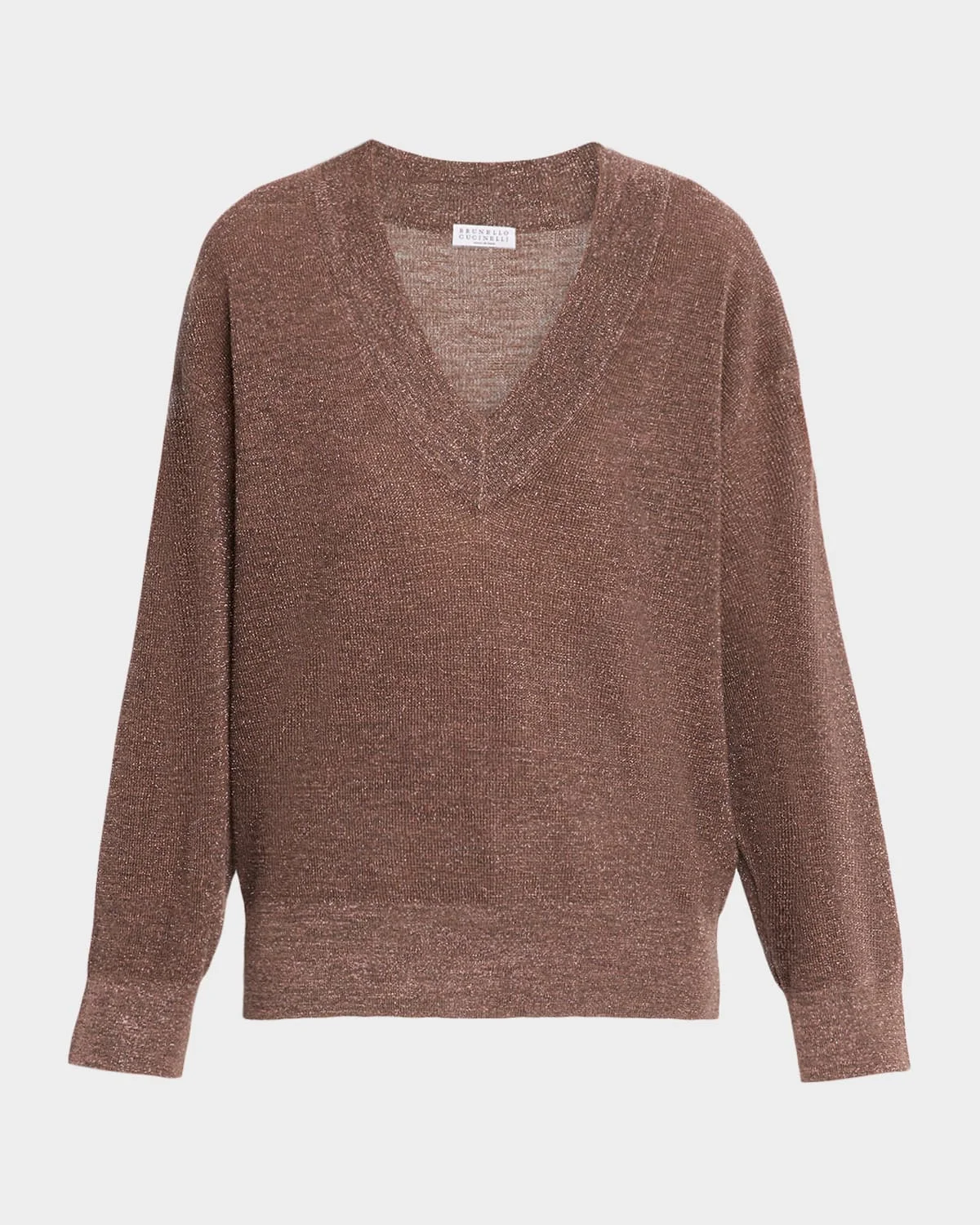 Crafted from linen knit, this sweater from Brunello Cucinelli features & nbsp;lame threads that sparkle throughout V neckline Long sleeves Drop shoulders Loose fit Hip lnegth Ribbed cuffs and hem Linen/polyester/nylon/polyamide Dry clean Made in Italy