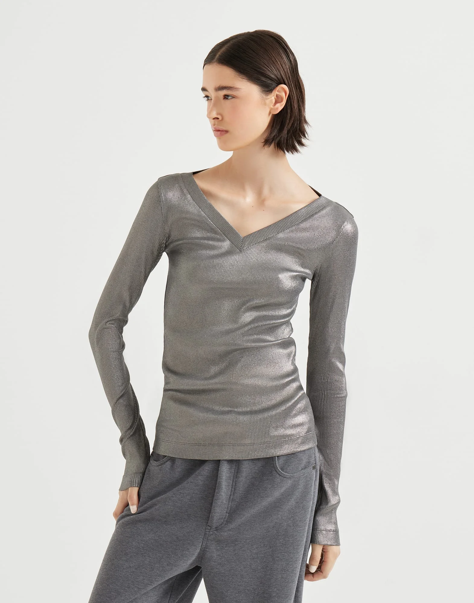 Sheen and color enrich this new long sleeve T-shirt in sparkling stretch cotton ribbed jersey. The fabric uses a lame thread that enhances the season’s colors with delicate metallic reflections, while the rib knitting emphasizes the fitted silhouette. The shiny monili embroidery, the iconic embellishment of the Brunello Cucinelli collections, completes the style with an additional sparkling note. MATERIALS A metallic thread enriches the classic rib knitting of the new stretch cotton jersey and enhances the season's colors. A small percentage of synthetic fiber provides added comfort. DETAILS V-neck Regular shoulder Regular sleeve Nickel-free monili decoration 95% COTTON, 5% ELASTANE