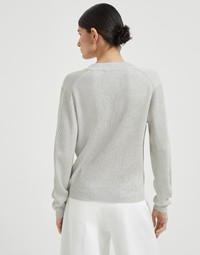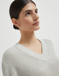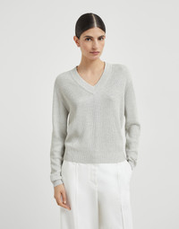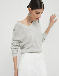 This new sparkling cotton vanise sweater reinterprets informal style with shiny details and sophisticated workmanship. The classic English rib knit is enriched by the vanise technique, enhanced by the presence of a precious lame thread that adds shimmering reflections to the garment’s surface. The sweater offers a close fit, with regular shoulders and sleeves, shaping and accentuating the feminine silhouette. MATERIALS The vanise technique combines cotton yarns of different colors for a melange effect that adds depth and texture to the garment. The addition of a thin lame thread enriches the workmanship with its shimmering reflections. DETAILS V-neck Drop shoulder Regular sleeve English rib 72% COTTON, 22% VISCOSE, 6% POLYESTER