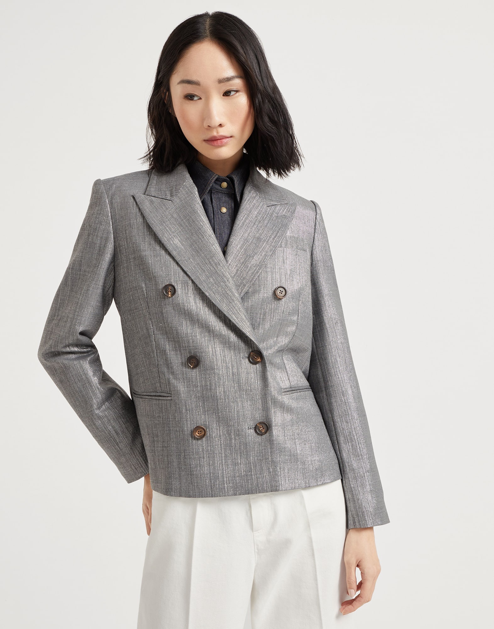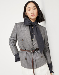 Refined fabrics and sartorial inspiration come together in this sparkling techno virgin wool twill blazer. Inspired by the world of men’s tailoring, the style features elegant peak lapels and slightly oversized shoulders, while the double-breasted closure harmoniously highlights the waist. The shimmer of the lame thread provides a very feminine, metallic appearance throughout the garment’s surface, while the monili embroidery, the iconic embellishment of the Brunello Cucinelli collections, leaves a shiny trail behind the neck for a further sparkling note. MATERIALS The fabric combines the natural softness of virgin wool with the sheen of the lurex thread inserted in the warp, and has a very pleasant hand. The small percentage of synthetic fiber provides added comfort. DETAILS Horn button closure Silk-blend crepe lining Peak lapel Welt pockets and chest pocket Cuffs have four horn buttons Nickel-free monili decoration 32% POLYESTER, 27% VISCOSE, 26% VIRGIN WOOL, 8% METAL, 4% NYLON, 3% ELASTANE