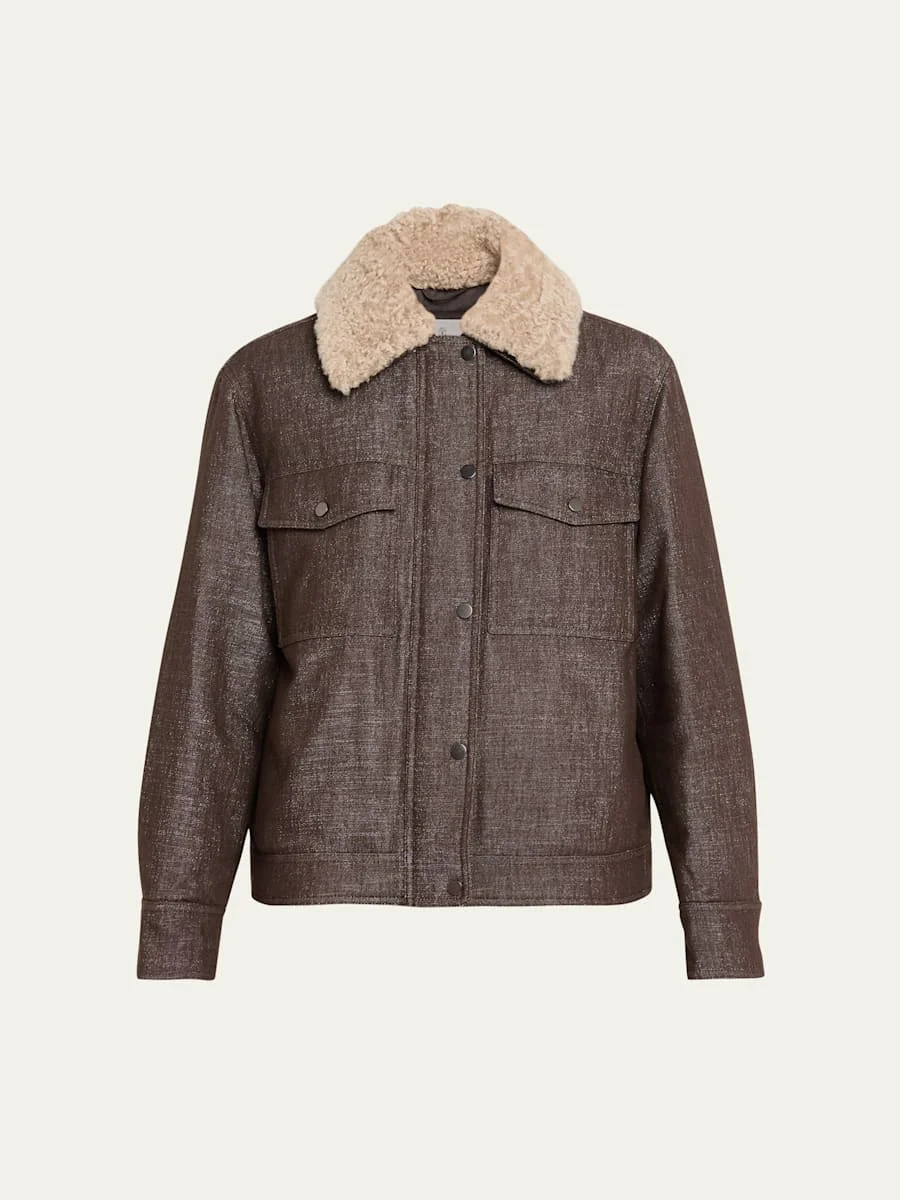 Accented with signature brass monili trim, this padded jacket by Brunello Cucinelli is crafted from a sparkling blend of virgin wool and cotton Detachable natural and dyed lamb shearling (France) collar Long sleeves; button cuffs Chest flap pockets with snap closures Relaxed fit Mid-length Front zip/snap placket Cotton/virgin wool/shearling Lining: Nylon Fill: Polyester, Feather/Down Dry clean Made in Italy Online Inquiries: BGS21_BA4KP| Store Inquiries: #5034195