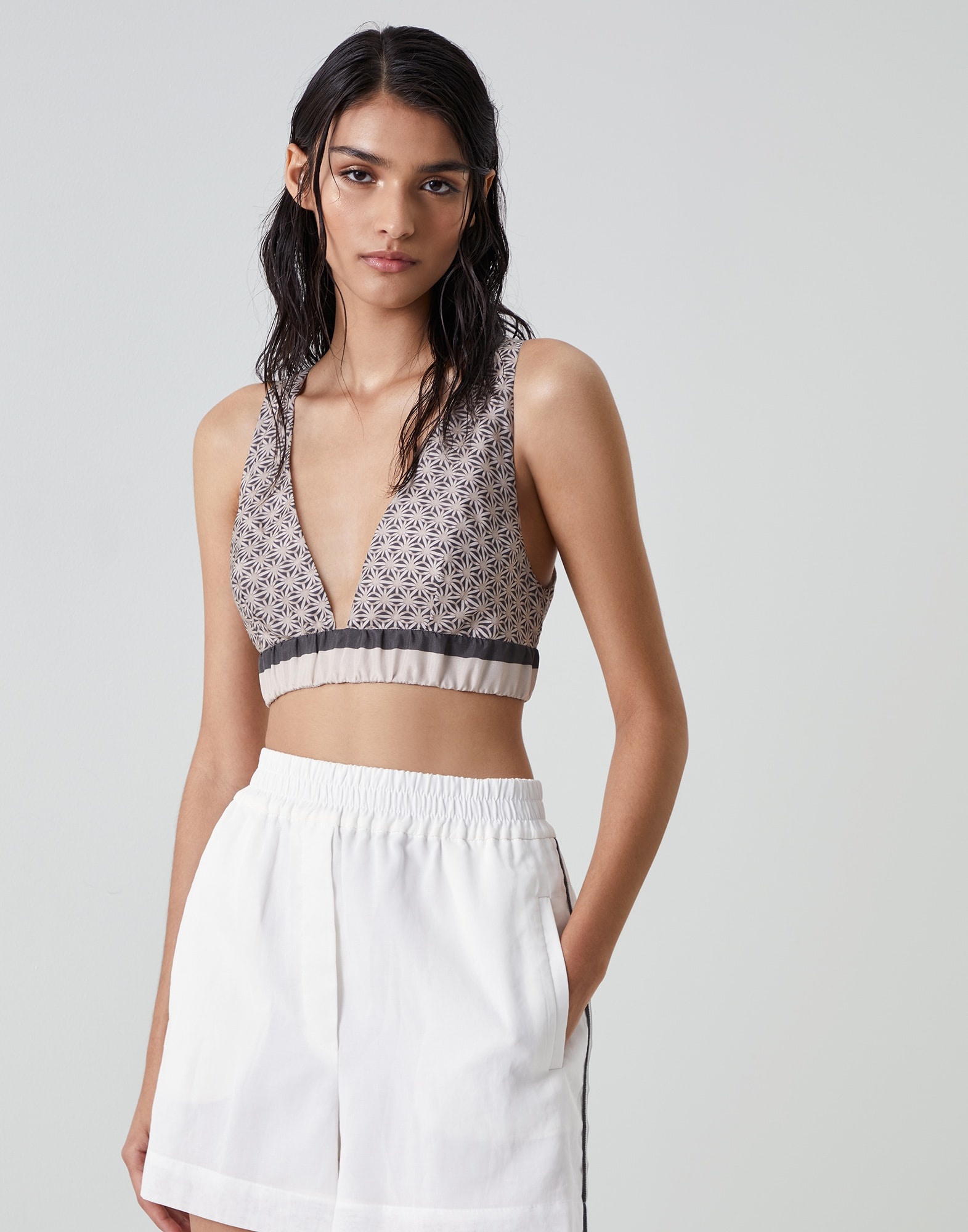 The season’s patterns and refined fabrics enrich the contemporary style of this Bralette top. Fluid and semi-glossy, the ultra lightweight fabric showcases a floral-inspired print in the season’s colors, which gives the top a sophisticated allure and highlights the natural elegance of the silk pongee. The minimal lines with elasticized bottom make the Bralette top ideal to complete the season’s looks with originality. MATERIALS Pure silk pongee is a refined fabric characterized by a fluid texture and a semi-glossy appearance. This fabric is printed in the season’s colors to recreate a delicate floral design. DETAILS Wide neckline Cased elastic cuff Zip opening at back of neck Lined 100% SILK