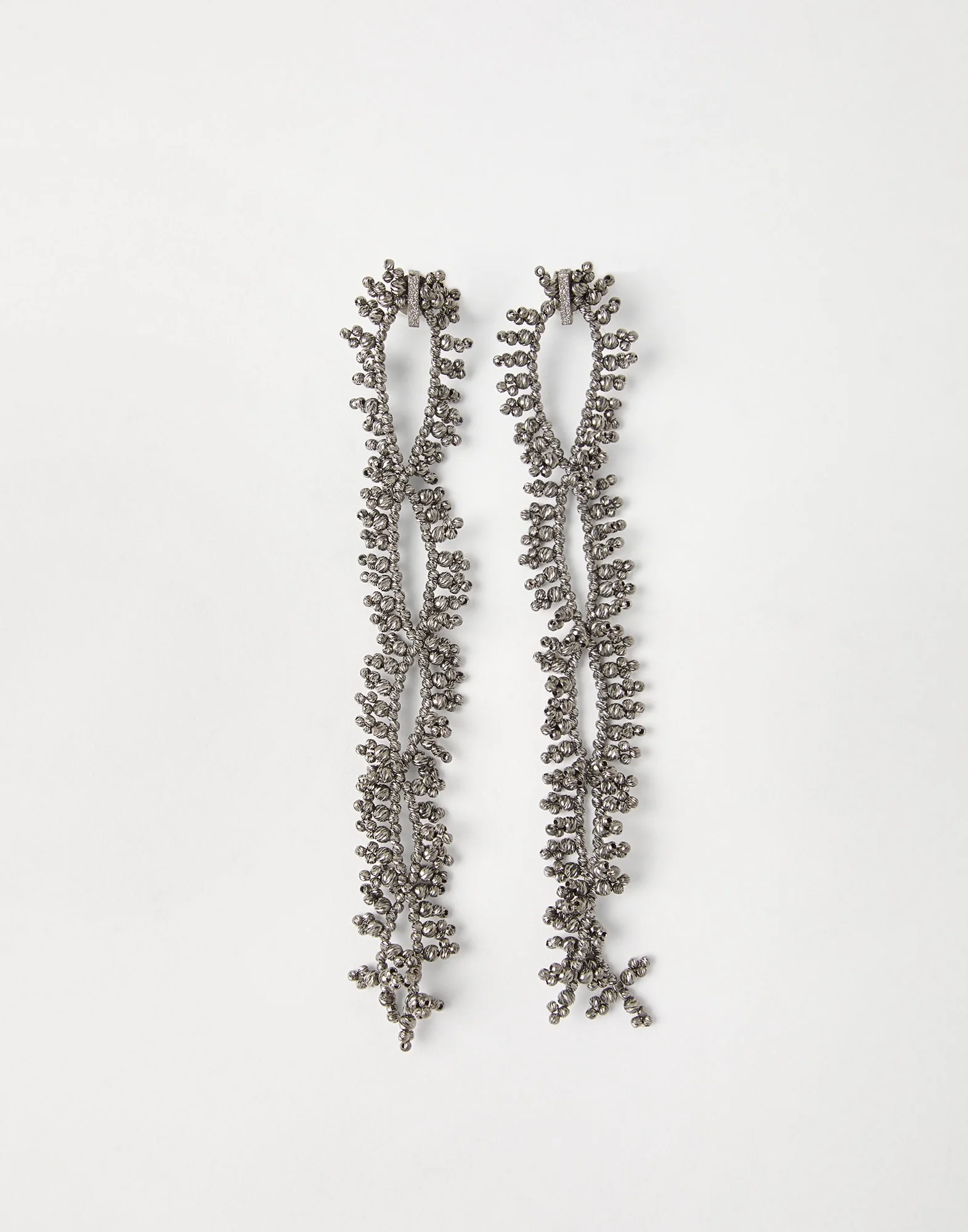 A sophisticated, feminine design characterizes these new Sterling Silver knotted earrings. A single long thread is embellished with intertwining silver beads which, thanks to their multifaceted workmanship, create a sophisticated play of reflections across the accessory. The jewelry features a practical butterfly closure. MATERIALS 925 Sterling Silver is a precious metal that gives the accessory delicate sparkling reflections. DETAILS Friction fastening The length of the earrings is approximately 14 cm (5.51")
