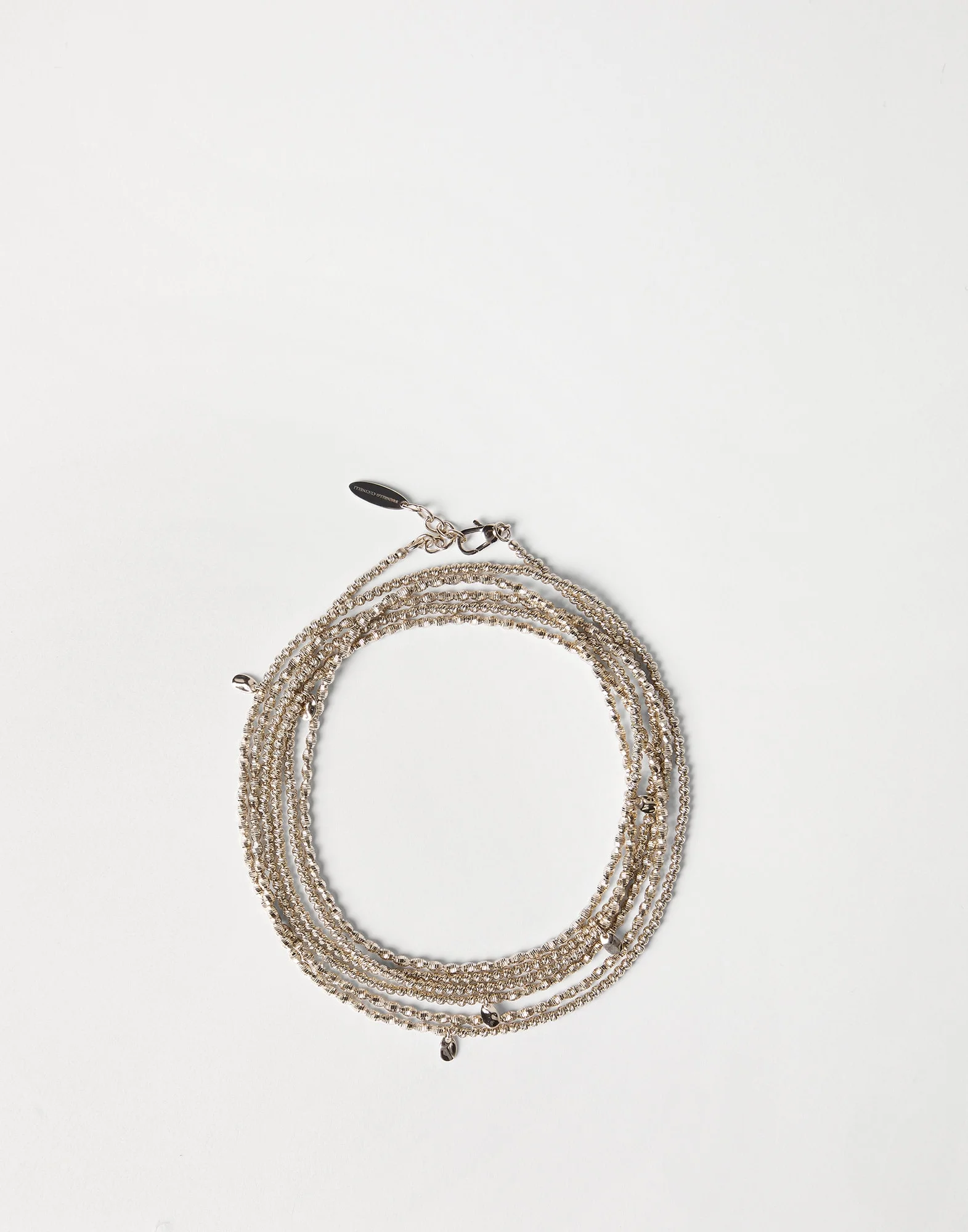 An elegant interplay of shiny reflections enriches this Hematite and Sterling Silver bracelet. The individual beads that make up the accessory feature a special faceted finish that enhances the jewelry’s brilliance. Versatile and essential, the bracelet is made of a long single strand that can be wrapped multiple times around the wrist for an elegant layered look, or worn as a necklace, for countless styling options. The accessory is completed with a hook closure adjustable to different lengths. MATERIALS The faceted cut of the Hematite and 925 Sterling Silver beads enhances the sparkling reflections of this bracelet, enriched with an artisan technique that engraves the metal to accentuate the surface’s shiny effect. All of the metal components are coated with precious materials that completely replace Nickel, enriching the excellence of every single detail. DETAILS Adjustable length closure clasp The maximum length of the open necklace measures approximately 209 cm (82.28") Nickel-free monili decoration 925 STERLING SILVER