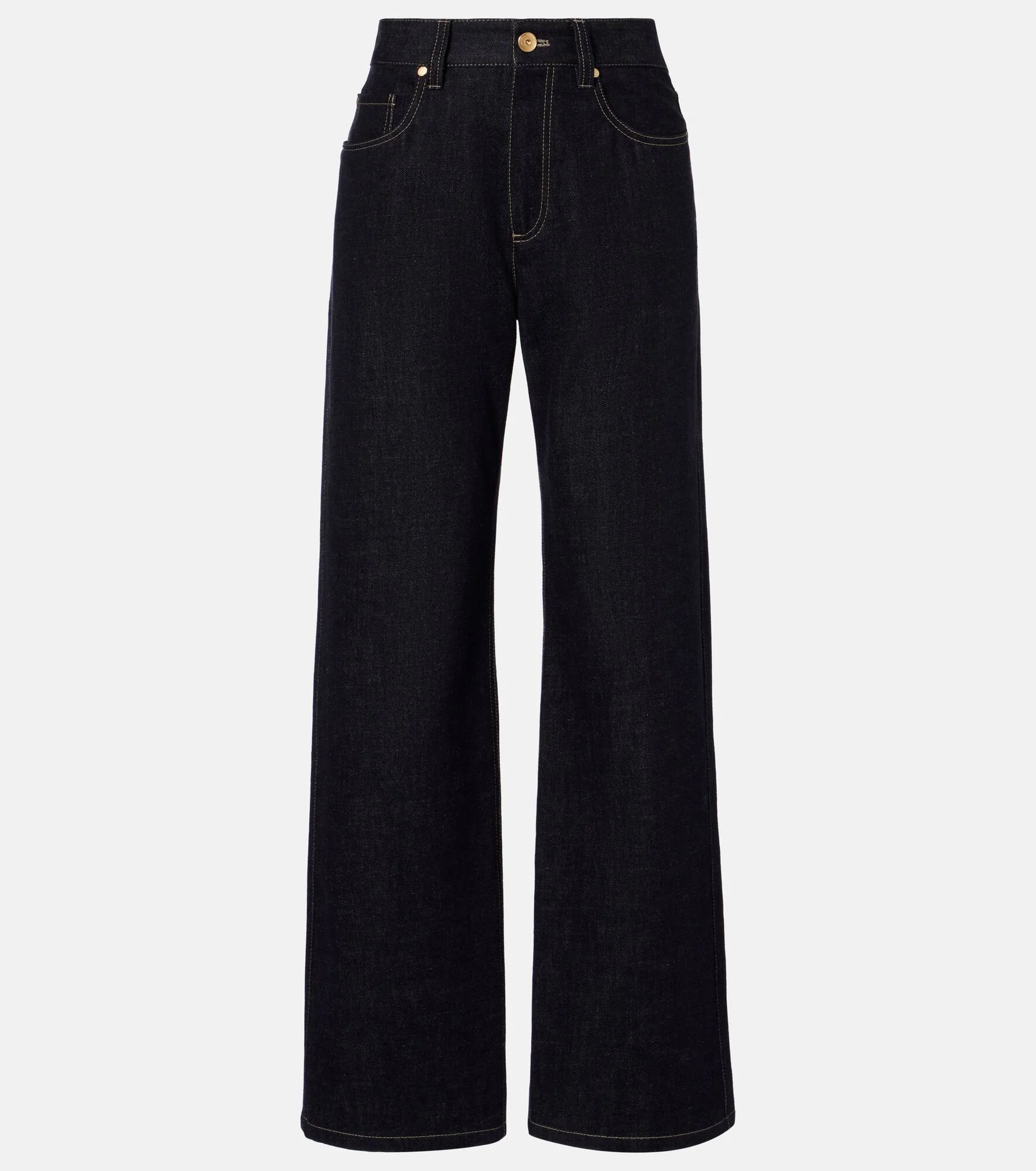 Brunello Cucinelli's designs are created in Solomeo, a medieval hamlet whose art and traditions are woven into the house's every fiber. Made from pure cotton denim, these straight jeans are complete with belt loops and classic five pockets. Product Details - Material: 100% cotton - Care instructions: machine wash at 30 degrees - Made in Italy - Designer color name: Blu - Item color: blue - Lining: 100% cotton - Details: 100% leather - Insert: 100% brass - Contains non-textile parts of animal origin - Hardware color: gold - Closure: zip and button fastening - Pockets: five pockets - Belt loops - Item number: P01091749 Size & Fit - True to size - Non-stretchy fabric - Straight leg - Mid-rise - Height of model is 175cm-69" and wears a size IT 40