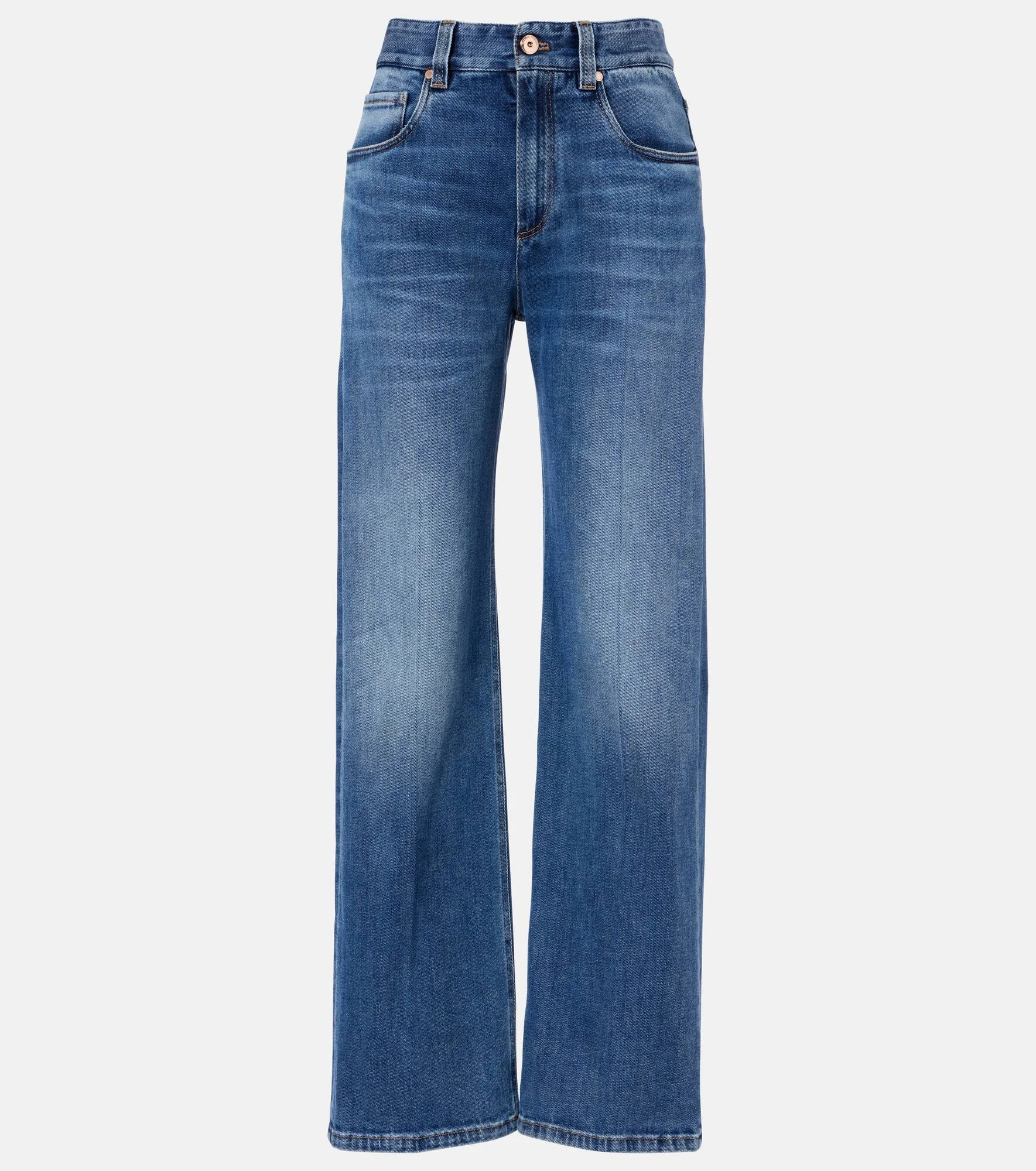 Brunello Cucinelli's designs are created in Solomeo, a medieval hamlet whose art and traditions are woven into the house's every fiber. These jeans are shaped to a straight-leg silhouette with the brand's Monili bead detailing at the belt loops. Product Details - Material: 99% cotton, 1% elastane - Care instructions: machine wash at 30 degrees - Made in Italy - Color: blue - Designer color name: Essential Dark Blue Denim - Closure: zipper fly, button fastening - Hardware color: bronze - Pockets: five pockets - Belt loops - Details: 100% brass - Contains non-textile parts of animal origin - Item number: P01143622 Size & Fit - True to size - Non-stretchy fabric - Wide-leg - Mid-rise - The model seen in the picture is 178cm-5'10" and wearing a size IT 40