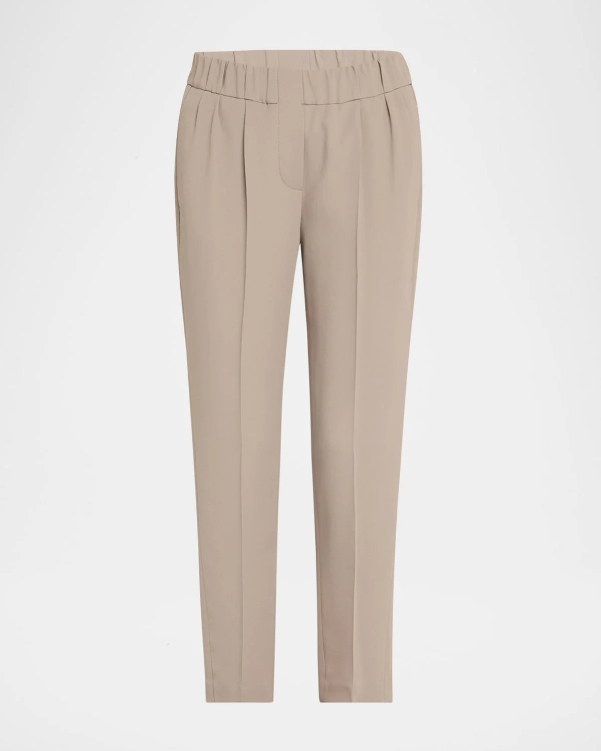 - Brunello Cucinelli silk pants fetauring an elastic waistband and front pleats - Mid rise sits high on hip - Side slip pockets; back welt pockets - Straight legs - Cropped at the ankle - Pull-on style - Acetate/silk - Lining: Cupro/acetate/polyester - Dry clean - Made in Italy - Model is 5'10"/177cm.