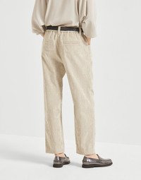 These new corduroy Baggy trousers represent a harmonious mix of tailored details and casual styling. The front pleats give the garment a clean, essential silhouette for an impeccable yet relaxed fit. MATERIALS Comfort cotton corduroy is characterized by a soft, velvety three-dimensional texture. The noble qualities of the natural fiber, such as softness and breathability, are paired with a small percentage of synthetic fibers to preserve the fabric’s structure. DETAILS Pull-up trousers Front pockets Back pockets Pleat Unlined 99% COTTON, 1% ELASTANE