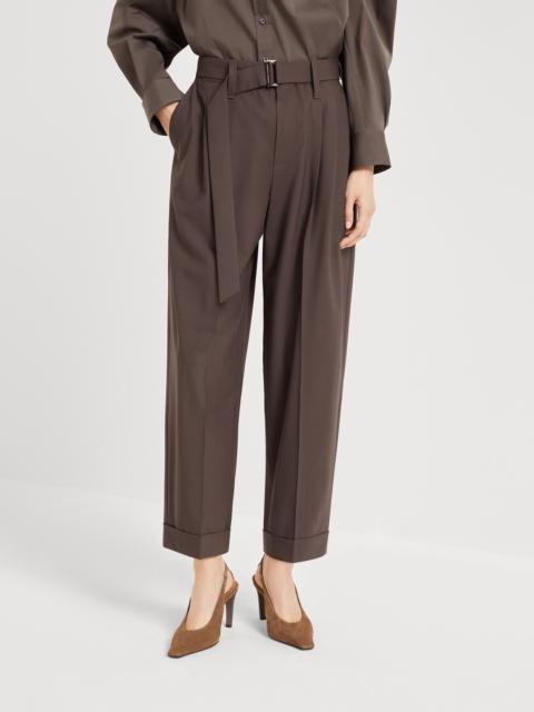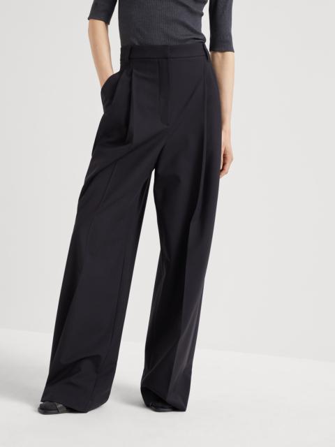 Refined materials and tailored details define the style of these new Sartorial Baggy trousers. The double front pleats give the relaxed design a clean, elegant silhouette, ensuring an impeccable fit. The shiny monili detail completes the garment with a feminine sparkle in true Brunello Cucinelli style. MATERIALS The lightweight fabric combines the virgin wool natural fiber with a percentage of synthetic to provide added comfort. DETAILS Zip closure with metal hook and backing button Front pockets Double pleat Back welt pockets with button Unlined Nickel-free monili decoration 75% VIRGIN WOOL, 23% NYLON, 2% ELASTANE