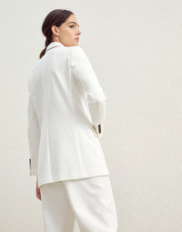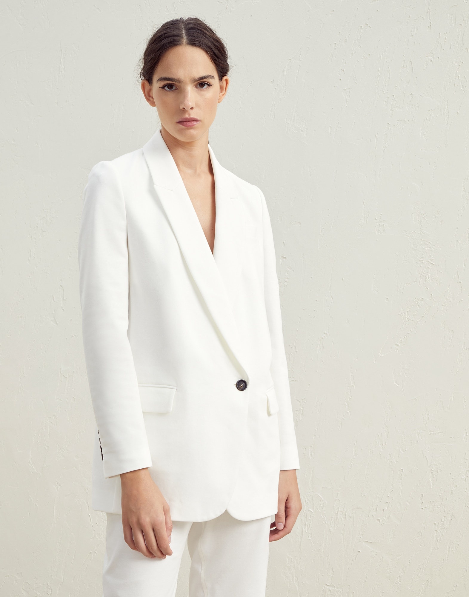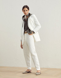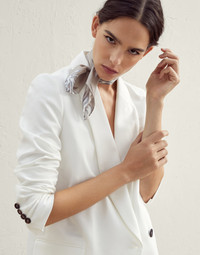 Classic styling and an essential, elegant silhouette characterize the style of this new cotton Couture interlock blazer. The horn button and hand flap pockets details stand out on the smooth, compact texture. Furthermore, a shiny monili embroidery behind the neck completes the style of this blazer with an unexpected sparkling and feminine detail in true Brunello Cucinelli style. MATERIALS The cotton Couture interlock fabric is characterized by a compact, smooth and even surface, balanced between informality and refinement. Its stretch structure provides added comfort. DETAILS Peak lapel Horn button closure Chest pocket Hand pockets with flap Cuffs have four horn buttons Nickel-free monili decoration 78% COTTON, 16% NYLON, 6% ELASTANE