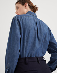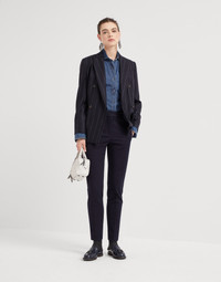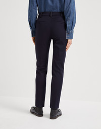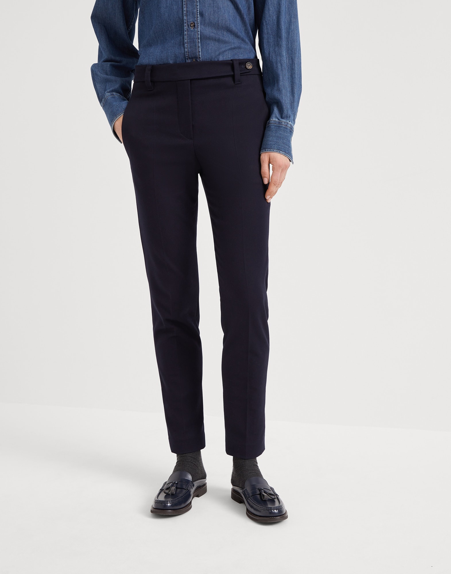 Timeless volumes and bright details characterize the iconic style of these stretch cotton cover cigarette trousers. The classic straight silhouette, conveying feminine elegance, is enriched by a shiny monili embroidery that illuminates the back loop with an unexpected sparkling note. MATERIALS Cover is a twill fabric characterized by a slightly pronounced diagonal texture. The sporty feel of the fabric is balanced by the yarn dyeing, which disperses the colors of the season with an intense and sophisticated look. A very small percentage of spandex provides added comfort. DETAILS Zip closure with button and backing button Front pockets Back welt pockets Nickel-free monili decoration 97% COTTON, 3% ELASTANE