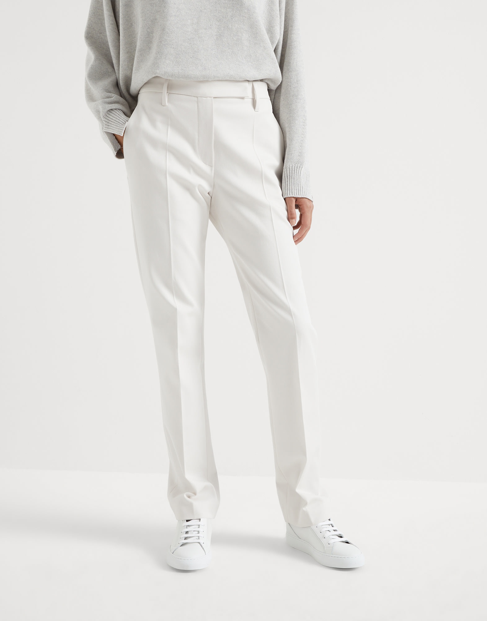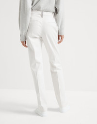 Timeless volumes and bright details characterize the iconic style of these stretch cotton cover cigarette trousers. The classic straight silhouette, conveying feminine elegance, is enriched by a shiny monili embroidery that illuminates the back loop with an unexpected sparkling note. MATERIALS Cover is a twill fabric characterized by a slightly pronounced diagonal texture. The sporty feel of the fabric is balanced by the yarn dyeing, which disperses the colors of the season with an intense and sophisticated look. A very small percentage of spandex provides added comfort. DETAILS Zip closure with metal hook and backing button Front pockets Back welt pockets Nickel-free monili decoration 97% COTTON, 3% ELASTANE