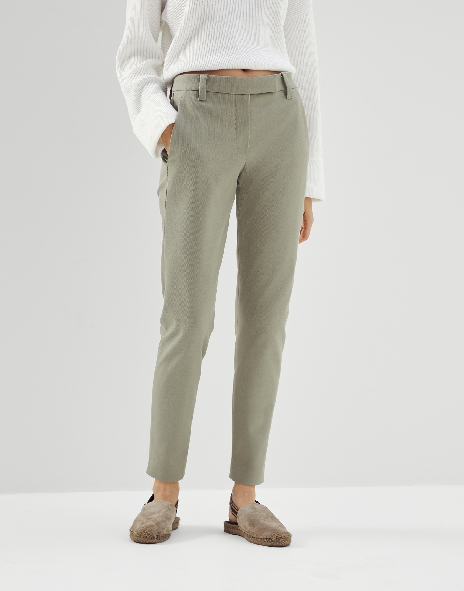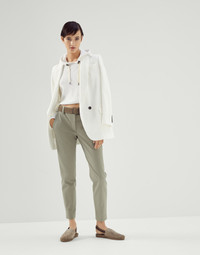The excellence of Brunello Cucinelli materials elevates the essential, versatile style of these slim fit trousers. The cotton cover enriches the season’s colors with its characteristic diagonal twill and slightly raised texture, while the fabric’s stretch effect pairs perfectly with the slim fit, showcasing lines close to the leg. MATERIALS Cover is a fabric characterized by a slightly pronounced diagonal texture. The sporty feel of the material is balanced by yarn dyeing, which disperses the colors of the season with an intense and sophisticated look. A very small percentage of spandex provides added comfort. DETAILS Zip closure with metal hook and backing button Front pockets Back welt pockets 97% COTTON, 3% ELASTANE