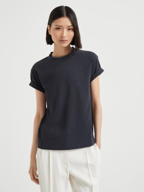 In the new t-shirt, the sporty flair of stretch cotton jersey meets the precious touch of monili, an iconic embellishment of Brunello Cucinelli’s collections. The V-neck is adorned with sparkling monili embroidery that adds an exquisitely feminine jewel-like detail to the garment. Regular lines and flat hems complement the fit and style of this t-shirt. MATERIALS A small percentage of spandex makes the lightweight, soft cotton jersey comfortable and pleasant to wear. DETAILS V-neck Flat pressed hem Nickel-free monili decoration 93% COTTON, 7% ELASTANE