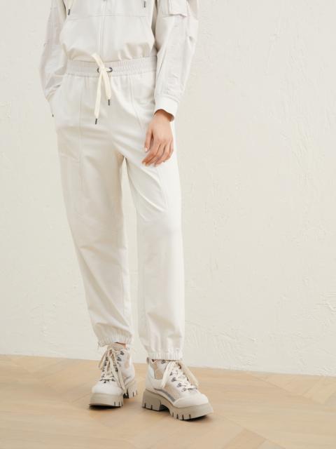 Refined Brunello Cucinelli materials are paired with the casual style of the Travelwear line, dedicated to moments of relaxation and leisure. Tailored elements and an informal attitude come together in these new cropped trousers in stretch cotton lightweight French terry. The pleats and ironed crease on the front elevate the design with an elegant touch, while the cropped fit adds a very feminine, casual appearance. The vertical front pockets and the rear patch pockets provide the garment with added function. MATERIALS The stretch characteristic of the lightweight cotton French terry makes the garment comfortable to wear. DETAILS Zip closure with button Pleat Back patch pockets 98% COTTON, 2% ELASTANE