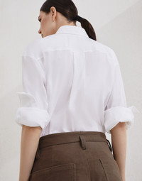 The modern proportions of these five-pocket barrel trousers are paired with refined Brunello Cucinelli materials. The stretch cotton moleskin complements the garment’s soft, rounded lines, highlighted by the double pleats that provide greater volume. An embroidery of rows of shiny monili on the rear belt loop adds a delicate, precious sparkling note. MATERIALS Stretch cotton moleskin is a compact, velvety fabric that features a matte surface that is soft to the touch. Warm and cozy, it has a small percentage of elastic fiber to provide added comfort. DETAILS Zip closure with button Front pockets with watch pocket Double pleat Back patch pockets Nickel-free monili decoration 98% COTTON, 2% ELASTANE