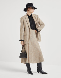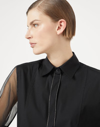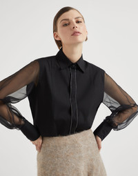 A sophisticated game of transparency provides this shirt with Shiny Trims an elegant allure. The garment alternates the smooth, lightweight hand of stretch cotton poplin with the crisp surface of luxurious Crispy silk, characterized by its impalpable texture. An embroidery of fine rows of shiny monili enriches the closure, completing the shirt with a refined detail in true Brunello Cucinelli style. MATERIALS The stretch cotton poplin is a year-round fabric with a lightweight texture that is extremely pleasant to wear. A small percentage of spandex provides added comfort. DETAILS Mother of pearl button closure Classic collar Cuffs have one mother of pearl button Nickel-free monili decoration 72% COTTON, 23% NYLON, 5% ELASTANE