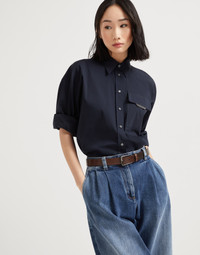 The season’s embellishments enrich the essential style of this stretch cotton poplin shirt. With a very feminine cropped cut, the garment showcases relaxed lines with slightly full sleeves. A shiny monili embroidery enriches the chest pocket with a delicate sparkling note in true Brunello Cucinelli style. MATERIALS The stretch cotton poplin is a year-round fabric with a lightweight texture that is extremely pleasant to wear. A small percentage of spandex provides added comfort. DETAILS Button fastening with placket Classic collar Chest pocket Cuffs have one mother of pearl button Nickel-free monili decoration 72% COTTON, 23% NYLON, 5% ELASTANE