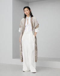 A precious embellishment enriches the style of the stretch cotton poplin shirt, an essential womenswear piece. The monili detail, an iconic element of the Brunello Cucinelli Collections, illuminates the back of the neck with a sparkling note. Relaxed proportions with slightly dropped shoulders are offered by the fit. MATERIALS The stretch cotton poplin is a year-round fabric with a lightweight texture that is extremely pleasant to wear. A small percentage of spandex provides added comfort. DETAILS Placket closure with mother of pearl buttons Classic collar Cuffs have one mother of pearl button Nickel-free monili decoration 72% COTTON, 23% NYLON, 5% ELASTANE