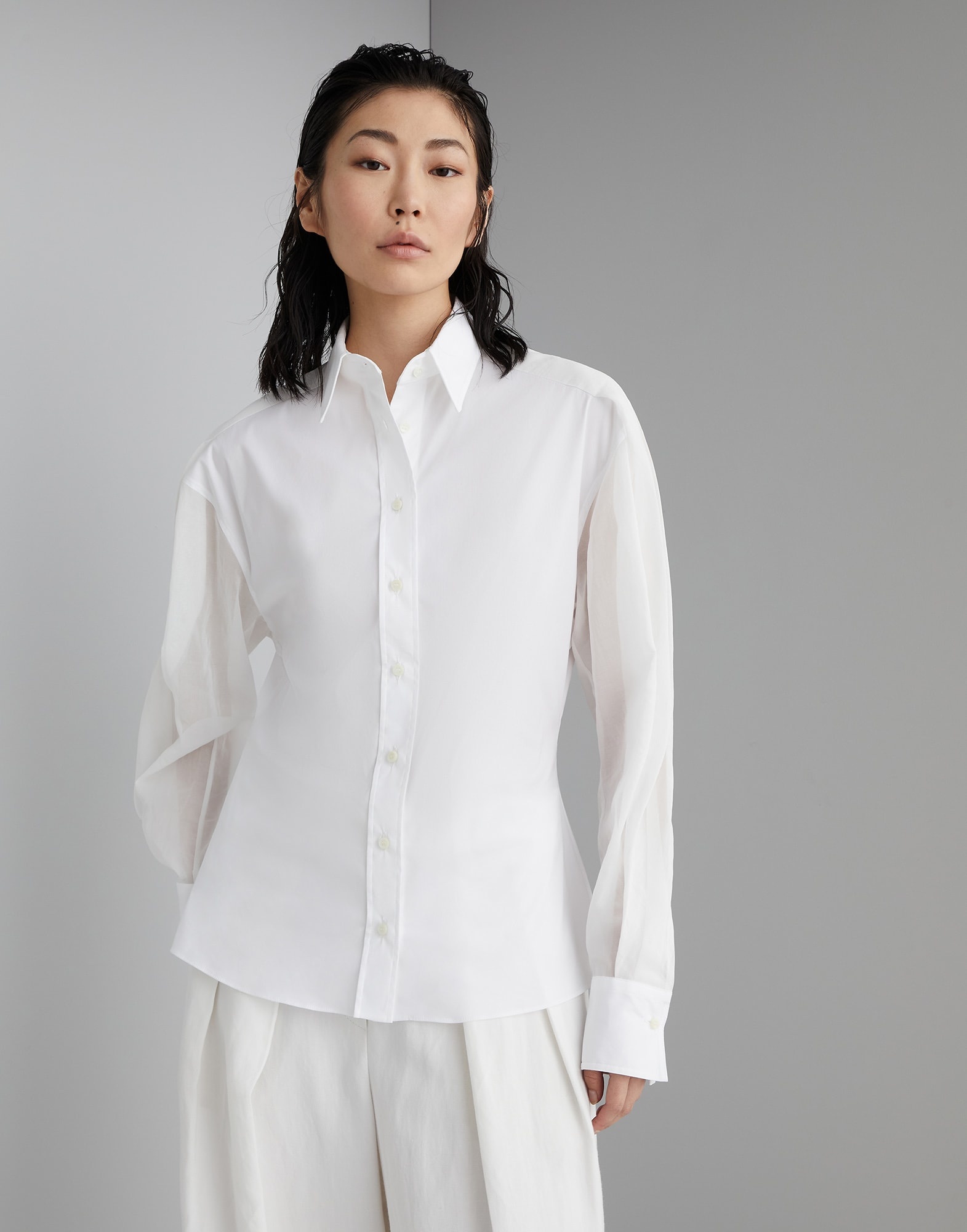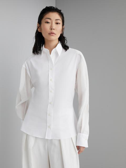 Stretch cotton poplin shirt with cotton organza sleeves and monili