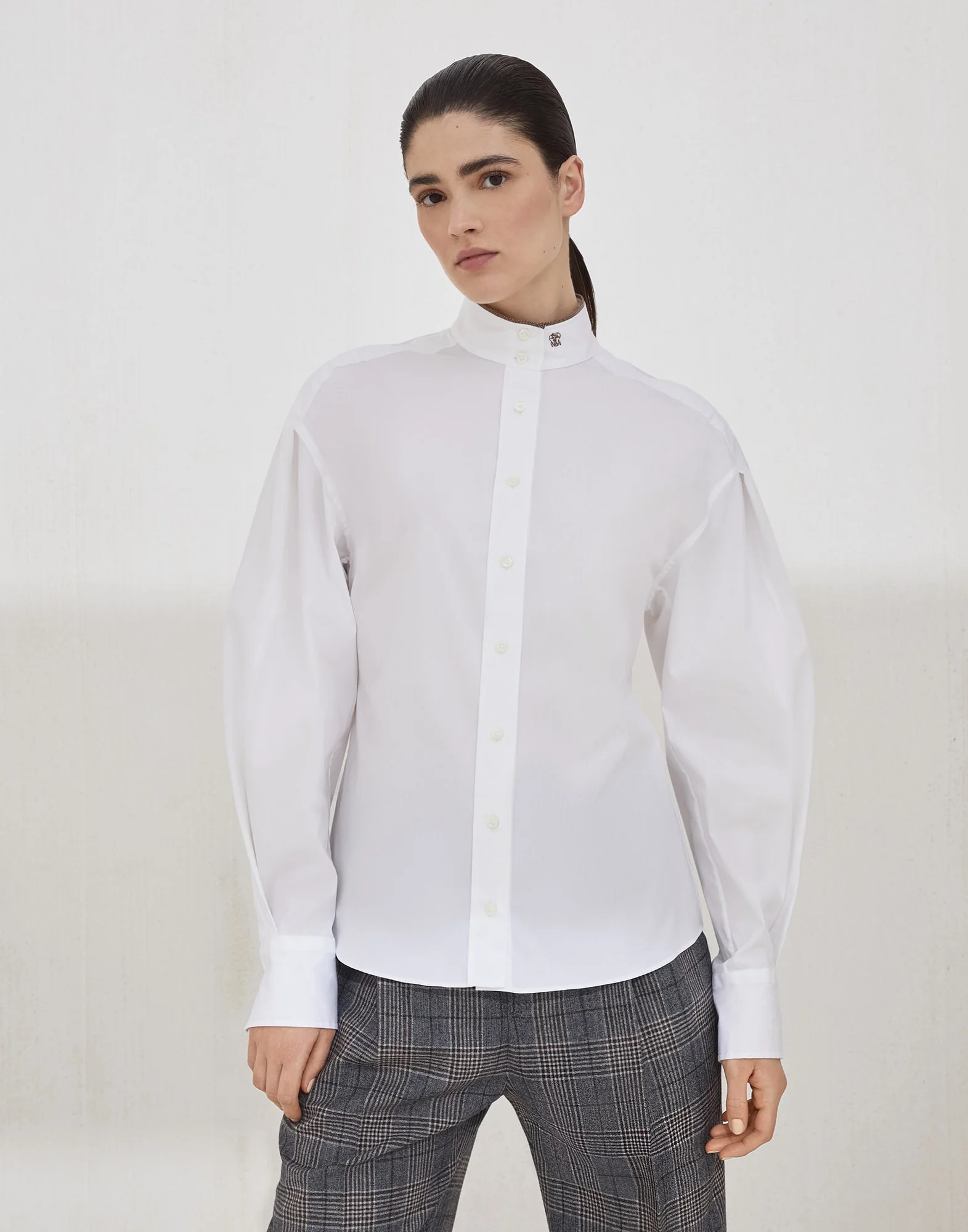 The iconic embellishment of the Brunello Cucinelli collections enriches this stretch cotton poplin shirt. Very feminine, the garment is characterized by generous balloon sleeves, a high collar and a straight hem. A shiny monili detail and the heraldic Solomeo crest embroidered on the collar give the shirt a distinctive touch of style. MATERIALS The stretch cotton poplin is a year-round fabric with a lightweight texture that is extremely pleasant to wear. A small percentage of spandex provides added comfort. DETAILS Placket closure with mother of pearl buttons High collar Cuffs have one mother of pearl button Balloon sleeve Nickel-free monili decoration 72% COTTON, 23% NYLON, 5% ELASTANE