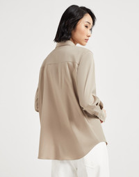 The iconic embellishment of the Brunello Cucinelli collections enriches this shirt in stretch cotton poplin, a classic fabric of the brand’s collections. A fine monili embroidery leaves a sparkling trail on the garment’s closure. The fit offers regular, comfortable proportions. MATERIALS The stretch cotton poplin is a year-round fabric with a lightweight texture that is extremely pleasant to wear. A small percentage of spandex provides added comfort. DETAILS Concealed button closure Classic collar Cuffs have one mother of pearl button Nickel-free monili decoration 72% COTTON, 23% NYLON, 5% ELASTANE