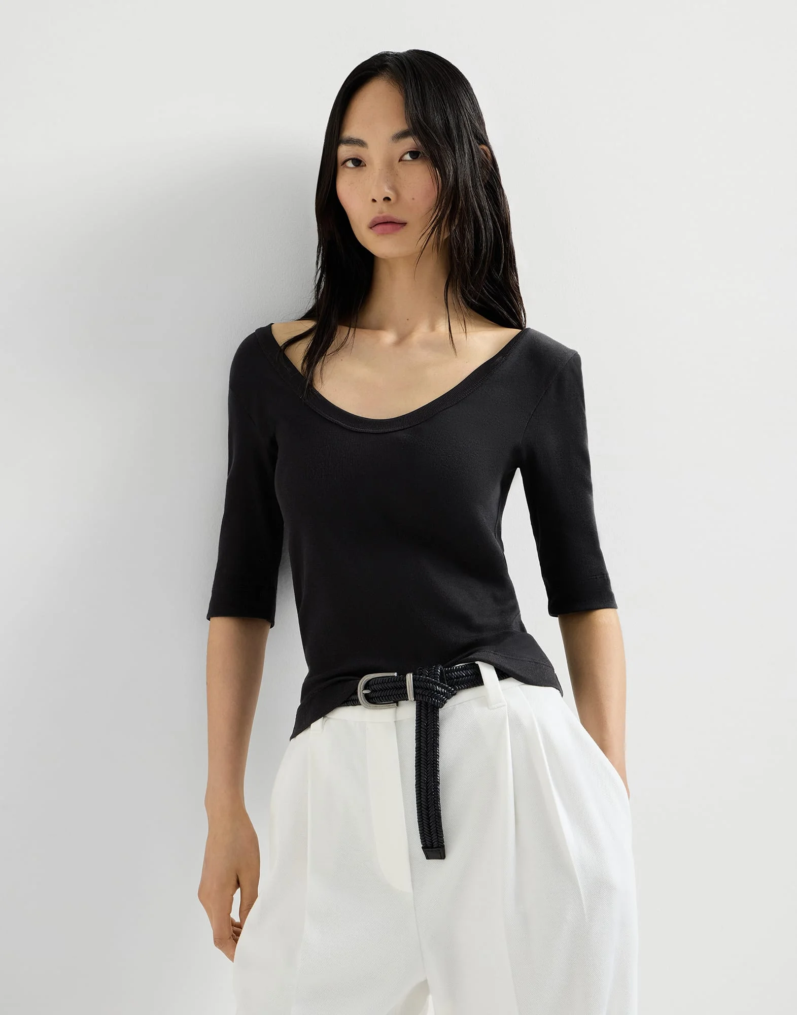 Refined materials and precious details enrich the versatile style of this stretch cotton ribbed jersey T-shirt. An essential element of a woman’s wardrobe, the garment is characterized by fitted proportions and a wide neckline. The shiny monili embroidery completes the design with a delicate sparkle in true Brunello Cucinelli style. MATERIALS A small percentage of spandex perfects the comfort of the lightweight and soft ribbed cotton jersey. DETAILS Wide neckline Regular shoulder Regular sleeve Nickel-free monili decoration 94% COTTON, 6% ELASTANE
