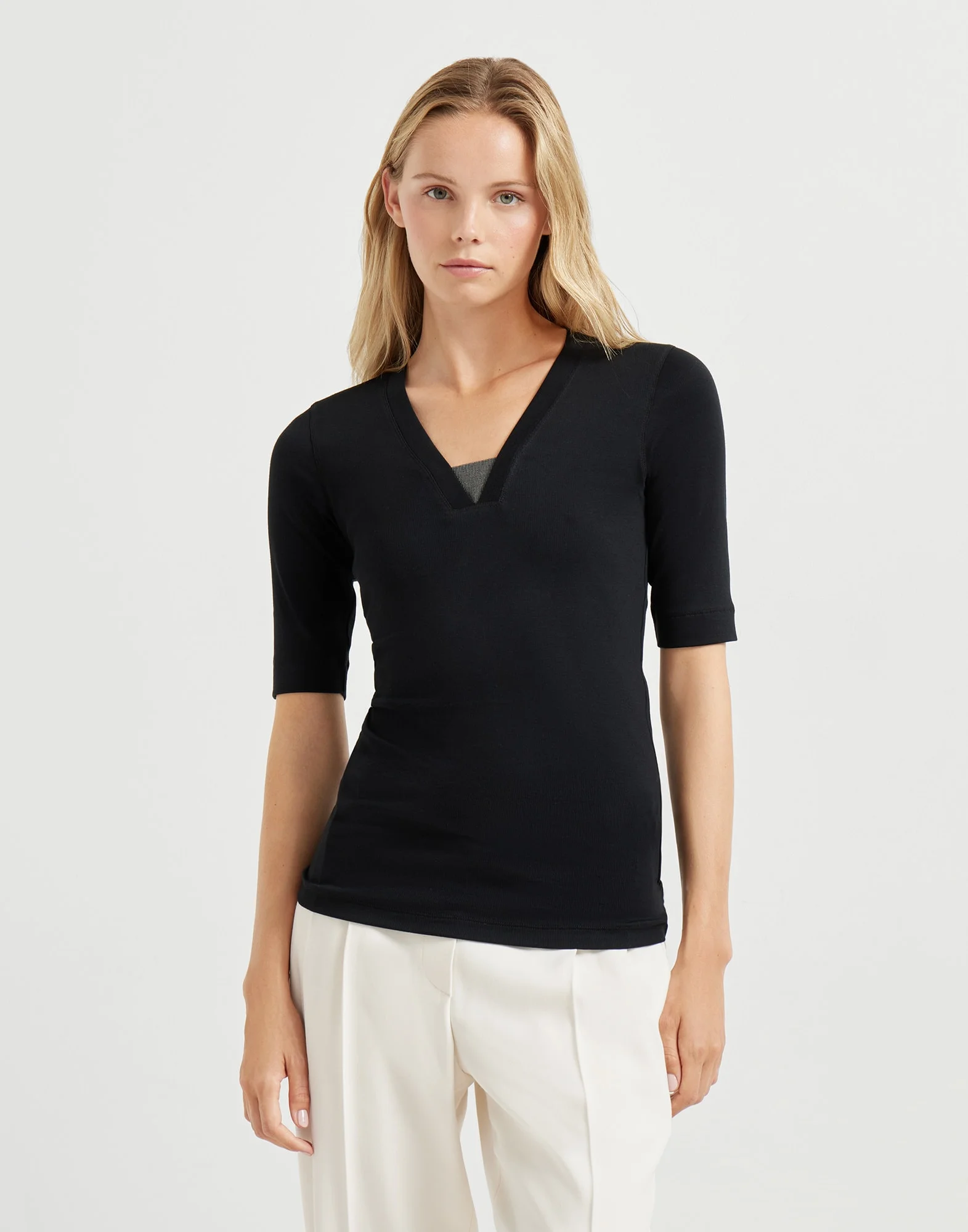 The iconic embellishment of the Brunello Cucinelli collections elevates the minimal style of this new ribbed stretch cotton jersey T-shirt. Its V-neck is enriched with a precious contrasting monili insert that gives the garment a radiant sparkle. The three-quarter sleeves the and slightly fitted lines define the silhouette. MATERIALS Inspired by menswear, the pure cotton jersey showcases the classic ribbed texture and offers a very comfortable, lightweight and extremely pleasant hand that is perfect for any season. DETAILS V-neck Nickel-free monili decoration 94% COTTON, 6% ELASTANE