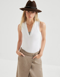 The casual flair of ribbed stretch cotton jersey meets the feminine touch of monili in this new top. A stripe composed of extremely thin monili rows stands out on the entirely ribbed surface, brightening up the deep V-neck with a radiant sparkle, in pure Brunello Cucinelli style. Regular lines define the fit of this piece. MATERIALS Inspired by menswear, the pure cotton jersey showcases the classic ribbed texture and offers a very comfortable, lightweight and extremely pleasant hand that is perfect for any season. DETAILS V-neck Nickel-free monili decoration 94% COTTON, 6% ELASTANE