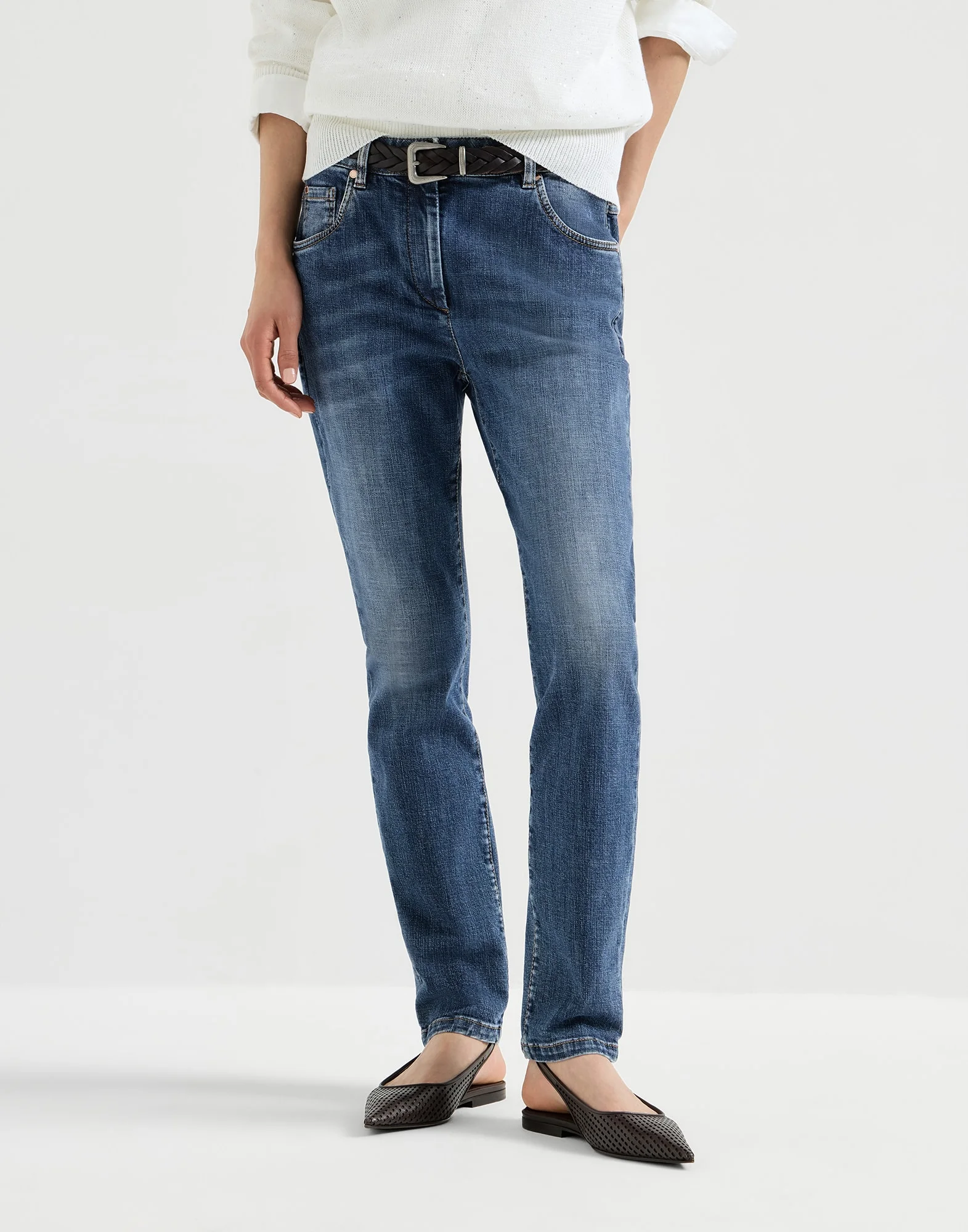 An essential, versatile design is paired with a slim fit in these denim trousers. The fabric’s iconic texture is combined with a stretch effect, perfectly complementing the fitted cut in the seat and leg. An elegant detail of the season enriches the back pocket: the embroidery of fine rows of monili on the leather tag adds a sparkling note to the garment. MATERIALS Stretch cotton denim is a lightweight and versatile fabric. A small percentage of spandex provides added comfort, particularly for styles that are fitted to the body. DETAILS Zip closure with button Front pockets with watch pocket Back patch pockets 98% COTTON, 2% ELASTANE