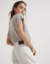 The soft texture of dyed stretch denim is paired with modern proportions in these Slim Tapered trousers. The silhouette is comfortable in the seat and then tapers at the bottom. The seams at the knees accentuate the shape’s contemporary attitude, while a small label embroidered in rows of shiny monili on the back pocket completes the garment with a precious note. MATERIALS The stretch cotton denim is garment-dyed in the season’s delicate colors. A small percentage of spandex helps to make the fabric comfortable to wear. DETAILS Zip closure with button Front pockets with watch pocket Back patch pockets Nickel-free monili decoration 96% COTTON, 4% ELASTANE