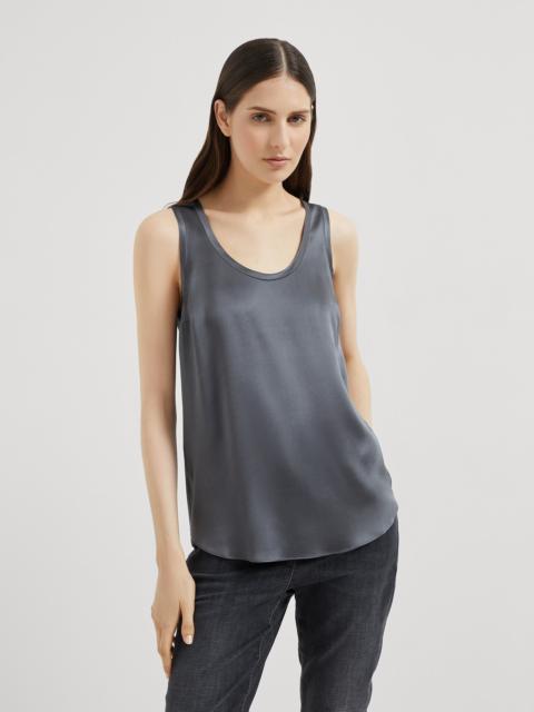 The essential lines of this reversible top are enriched with the excellence of Brunello Cucinelli’s materials and with a sophisticated attitude. The fluid and shiny texture of stretch silk satin enhances the slightly rounded silhouette of the top, a timeless women's wardrobe staple. MATERIALS Stretch silk satin, an elegant fabric with a shiny effect and flowing hand, represents a classic of Brunello Cucinelli fine materials. A small amount of synthetic fiber adds to wearer comfort. DETAILS Wide neckline 96% SILK, 4% ELASTANE