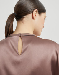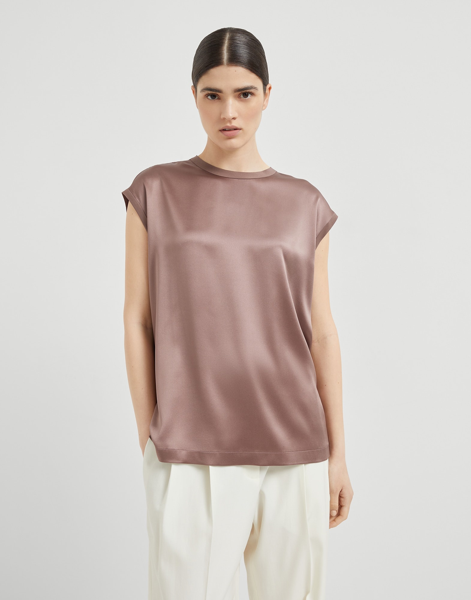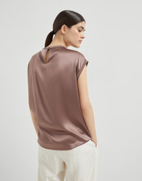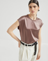 The iconic embellishment of the Brunello Cucinelli collections defines the style of this stretch silk satin T-shirt, an essential womenswear piece. The fabric’s glossy texture is combined with a shiny monili detail. The small button closure at the back of the neck makes it easy to wear the garment, which offers a comfortable fit and slightly dropped shoulders. MATERIALS Stretch silk satin, an elegant fabric with a shiny effect and flowing hand, represents a classic of Brunello Cucinelli fine materials. A small amount of synthetic fiber adds to wearer comfort. DETAILS Crew-neck Flat pressed hem Nickel-free monili decoration 96% SILK, 4% ELASTANE