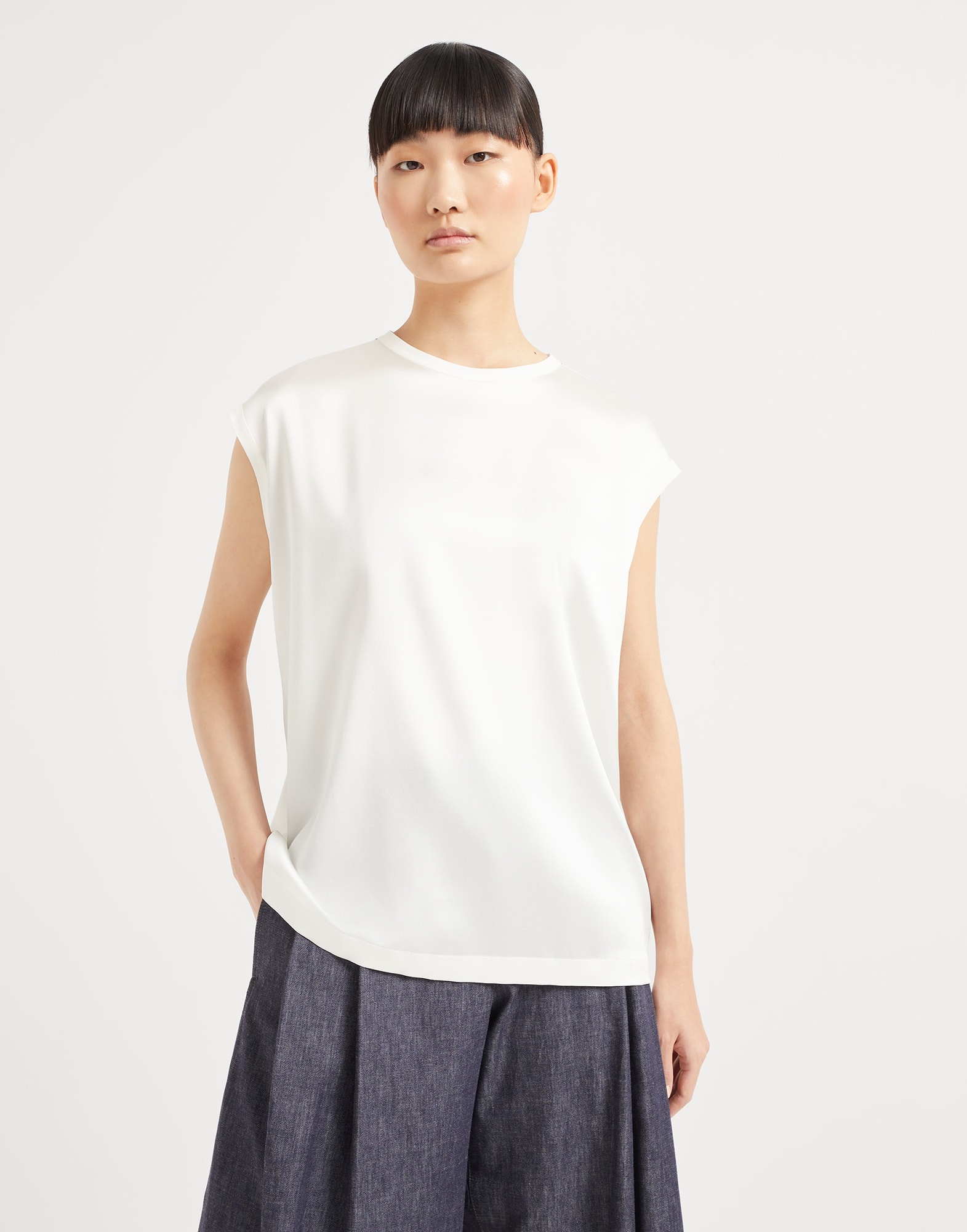 The iconic embellishment of the Brunello Cucinelli collections defines the style of this stretch silk satin T-shirt, an essential womenswear piece. The fabric’s glossy texture is combined with a shiny monili detail. The small button closure at the back of the neck makes it easy to wear the garment, which offers a comfortable fit and slightly dropped shoulders. MATERIALS Stretch silk satin, an elegant fabric with a shiny effect and flowing hand, represents a classic of Brunello Cucinelli fine materials. A small amount of synthetic fiber adds to wearer comfort. DETAILS Crew-neck Flat pressed hem Nickel-free monili decoration 96% SILK, 4% ELASTANE