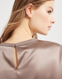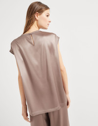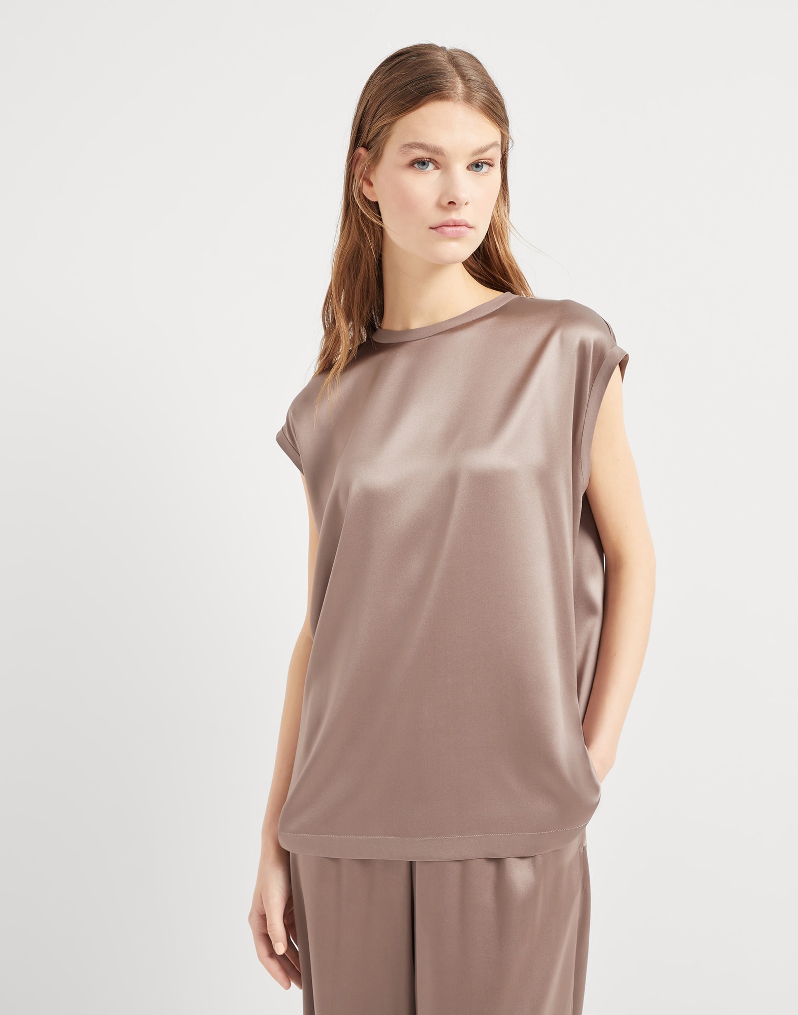 The iconic embellishment of the Brunello Cucinelli collections defines the style of this stretch silk satin T-shirt, an essential womenswear piece. The fabric’s glossy texture is combined with a shiny monili detail. The small button closure at the back of the neck makes it easy to wear the garment, which offers a comfortable fit and slightly dropped shoulders. MATERIALS Stretch silk satin, an elegant fabric with a shiny effect and flowing hand, represents a classic of Brunello Cucinelli fine materials. A small amount of synthetic fiber adds to wearer comfort. DETAILS Crew-neck Flat pressed hem Nickel-free monili decoration 96% SILK, 4% ELASTANE