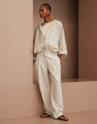 The iconic embellishment of the Brunello Cucinelli collections defines the style of this stretch silk satin T-shirt, an essential womenswear piece. The fabric’s glossy texture is combined with a shiny monili detail. The small button closure at the back of the neck makes it easy to wear the garment, which offers a comfortable fit and slightly dropped shoulders. MATERIALS Stretch silk satin, an elegant fabric with a shiny effect and flowing hand, represents a classic of Brunello Cucinelli fine materials. A small amount of synthetic fiber adds to wearer comfort. DETAILS Crew-neck Flat pressed hem Nickel-free monili decoration 96% SILK, 4% ELASTANE