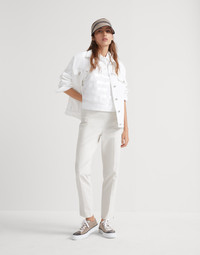 These new trousers in twisted stretch cotton twill combine the classic, summery Capri silhouette with the iconic embellishment of the Brunello Cucinelli collections. A monili detail decorates the rear belt loop, completing the garment with a sophisticated, sparking touch. MATERIALS The stretch cotton twill fabric is an ideal fabric for the summer: the texture is very light, even and slightly dry. A small percentage of spandex provides added comfort. DETAILS Pull-up trousers Front pockets Side vents at bottom Nickel-free monili decoration 97% COTTON, 3% ELASTANE