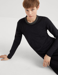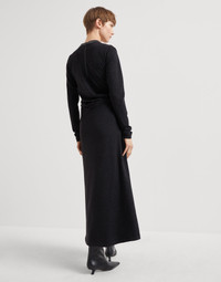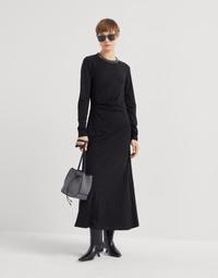 The lightweight, fluid effect of stretch virgin wool jersey pairs perfectly with the soft silhouette of this dress. The garment’s regular, versatile and feminine lines showcase subtle draping on the side, while the skirt develops with slightly flared proportions at the bottom. An embroidery of fine rows of monili illuminates the crew-neck, completing the dress with a radiant sparkle. MATERIALS The virgin wool jersey is a warm and lightweight fabric, embellished with a small percentage of synthetic fiber to make it even more comfortable to wear. DETAILS Crew-neck Regular sleeve Zip opening at back of neck Side zipper opening Vent at bottom Nickel-free monili decoration 94% VIRGIN WOOL, 6% ELASTANE